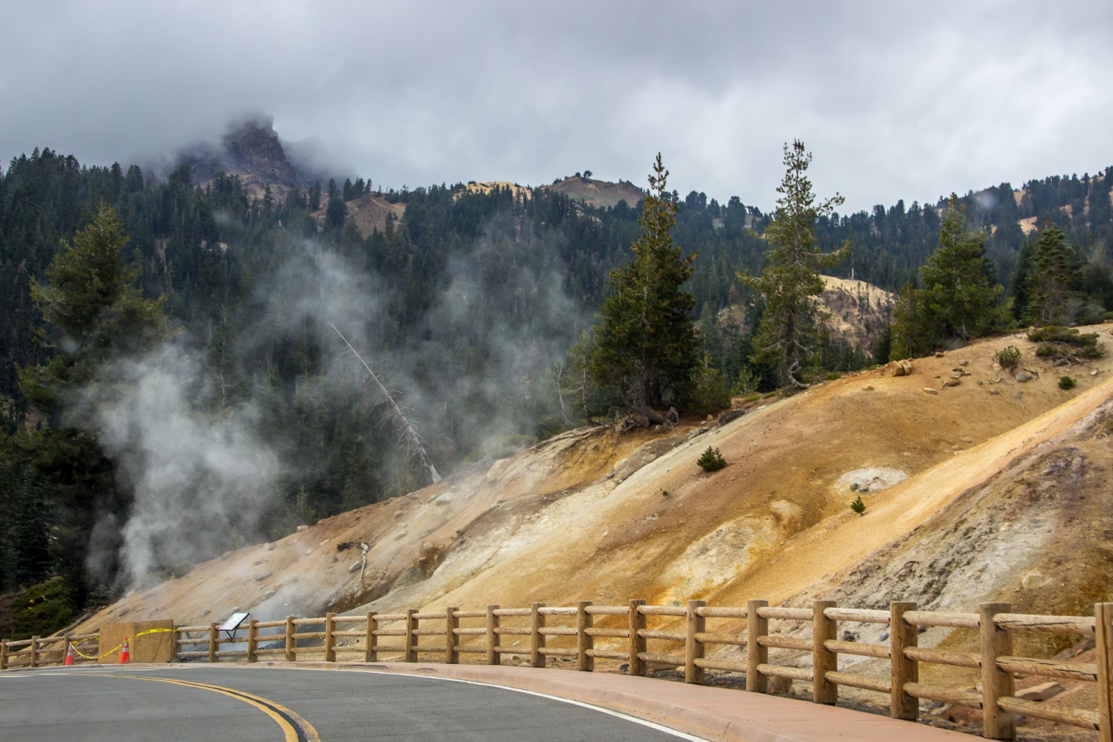 Shortly after rounding the bottom of the moountain we turned off the interstate and headed eastward, for the 90 mile journey from there to the entrance of Lassen Volcanic National Park. Lassen is one of the less well known parks in the system but it had quite a few visitors today. Lassen Peak last erupted in 1915 so it’s a very recent volcano and the park features many of the same sights we’d seen already on our trip through the volcanic Northwest. Lava flows, sulphur springs, boiling mud pots and steam spewing from fumaroles.