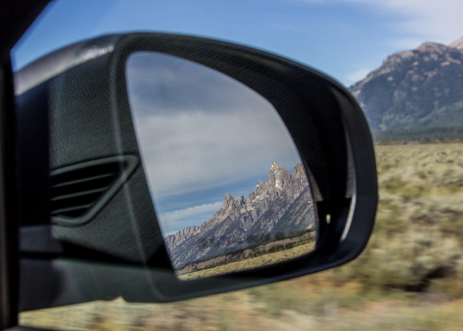We grabbed a breakfast croissant and coffee from the Starbucks in the lobby and sat there admiring the view from their incredible windows before finally checking out and heading onwards. However, I couldn’t resist a little final look at the mountains from the rear vision mirror!