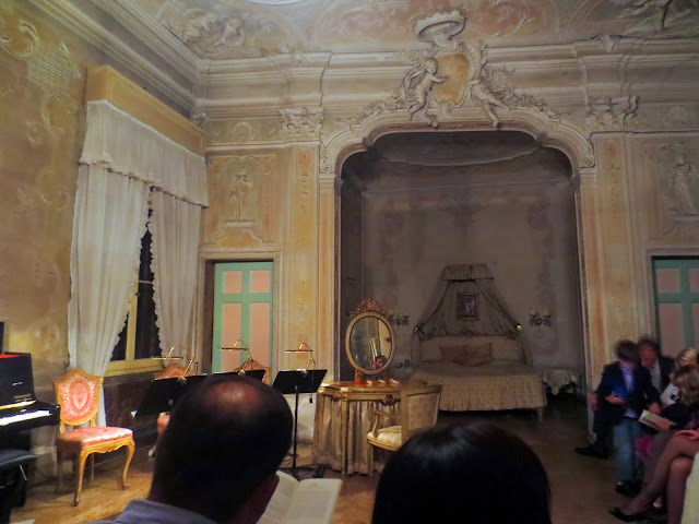 The singers were wonderful and it was such an intimate way to be part of a marvelous opera. Figaro and Rosina sang their asides to the people in the front rows and the faded grandeur of the room helped make the story come alive. At the first interval we enjoyed a glass of Prosecco in the ballroom facing out on the Grand Canal before being ushered into another grand sala for the next scene. the final scenes were performed in a gorgeous bedroom with cupids on the ceiling and and grandly draped bed. Sadly we were asked not to photograph the performance but I took a shot of the bedroom and also our view over the canal during interval.