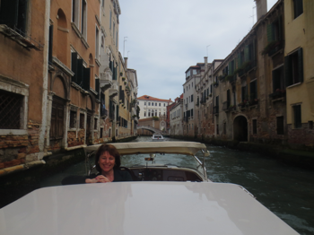 It took about 2 hours to drive from the heights of the passes down to sea level at Venice, and it really WAS downhill, every single step of the way. But at nearly 3pm we were driving the causeway across the lagoon to the city. We felt fortunate to find a parking spot in the massive Piazzale Roma parking garage where we’d been told to leave our rental car, but once we’d handed over the keys it was a short walk down to the canal and onto a water taxi for the 20 minute ride to the hotel.