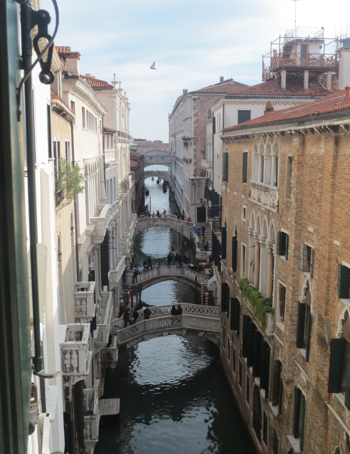 Checkin went smoothly until the clerk explained apologetically that they had a technician fixing the lift and that we’d have to walk up 4 flights but at least the bellboy helped with the luggage! It was worth the effort when we reached the room- it’s charming, decorated in grand Venetian style and has a wonderful view straight down the canal to he Bridge of Sighs and the Grand Canal beyond. We wandered down to St Marks square and I was a bit dismayed to see that the top of St Marks Basilica is covered with that European menace , scaffolding!! . So no wonderful pictures of the basilica for us! The square and waterfront was packed with tourists so we wandered through back lanes, stumbling on little campos ams pretty shops, and taking note of a nice little restaurant near the Grand Fenice Theatre where we returned later for dinner.