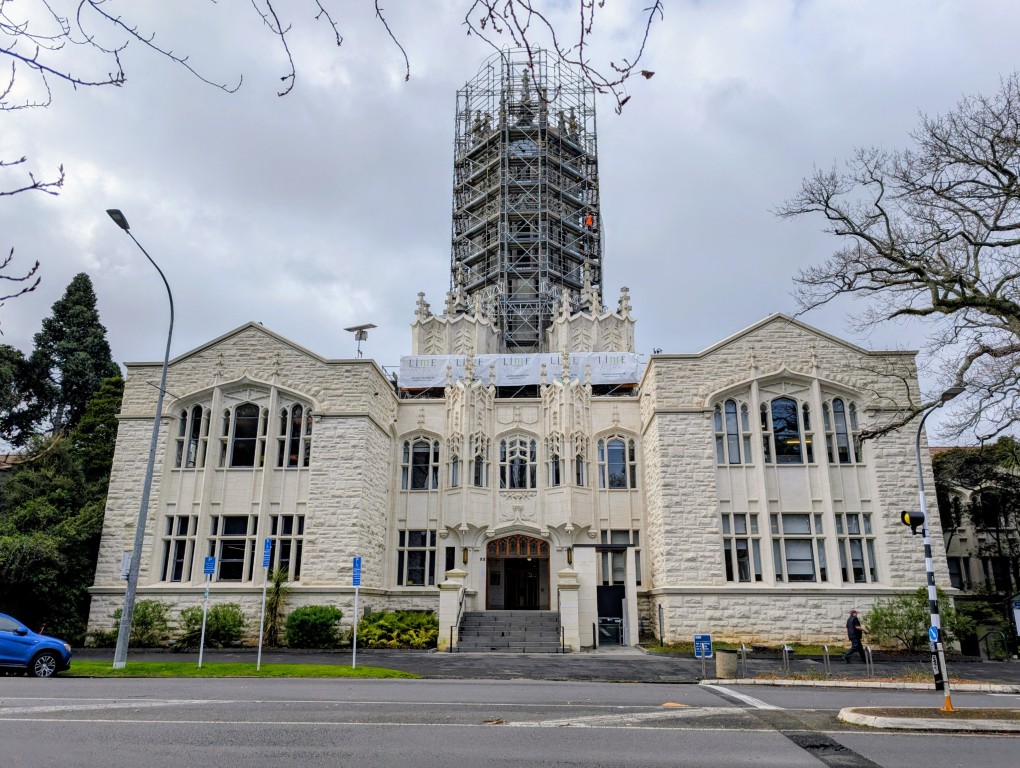 We retraced our steps back past our hotel, and then the easy, flat part of our day came to an abrupt end. For the next ten minutes, I was breathing hard as we climbed the steep hill up through Alfred Park. The University of Auckland borders the park, and I’d read that its old clock tower was worth seeing, but when we finally crested the hill, we found it completely swathed in scaffolding! Ah, the joys of travel.