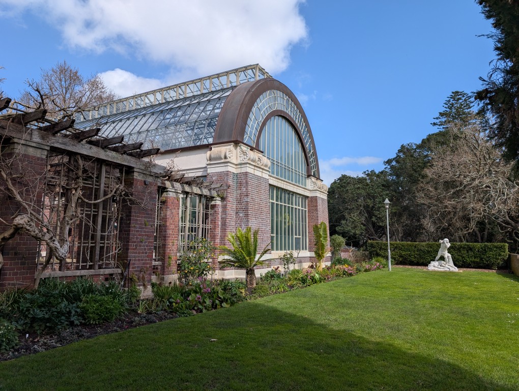 Our first stop was the huge Auckland Domain, which occupies a massive hill overlooking the city. The grand building of the Auckland War Memorial Museum dominates the top of the hill, and while we decided we didn’t have enough time to do the inside justice, we certainly admired its impressive frontage and the lovely memorial water feature out front. Also in the Domain is the Wintergarden, a pair of beautiful old greenhouses linked by a pretty courtyard. One is a temperate house, which had a surprisingly colourful display of flowers for this time of year, while the other is a tropical hothouse. We really felt the temperature difference in there! It was filled with ferns, palms, and oddities like a Venus Fly Trap, with a large central pond full of spectacular water lilies.