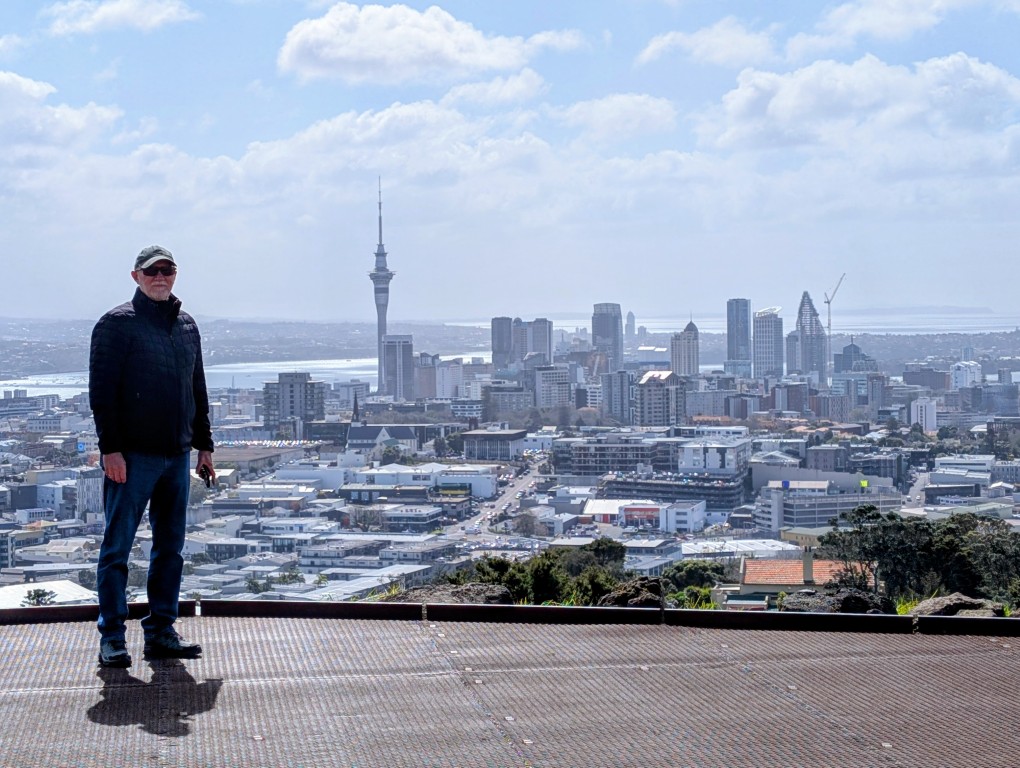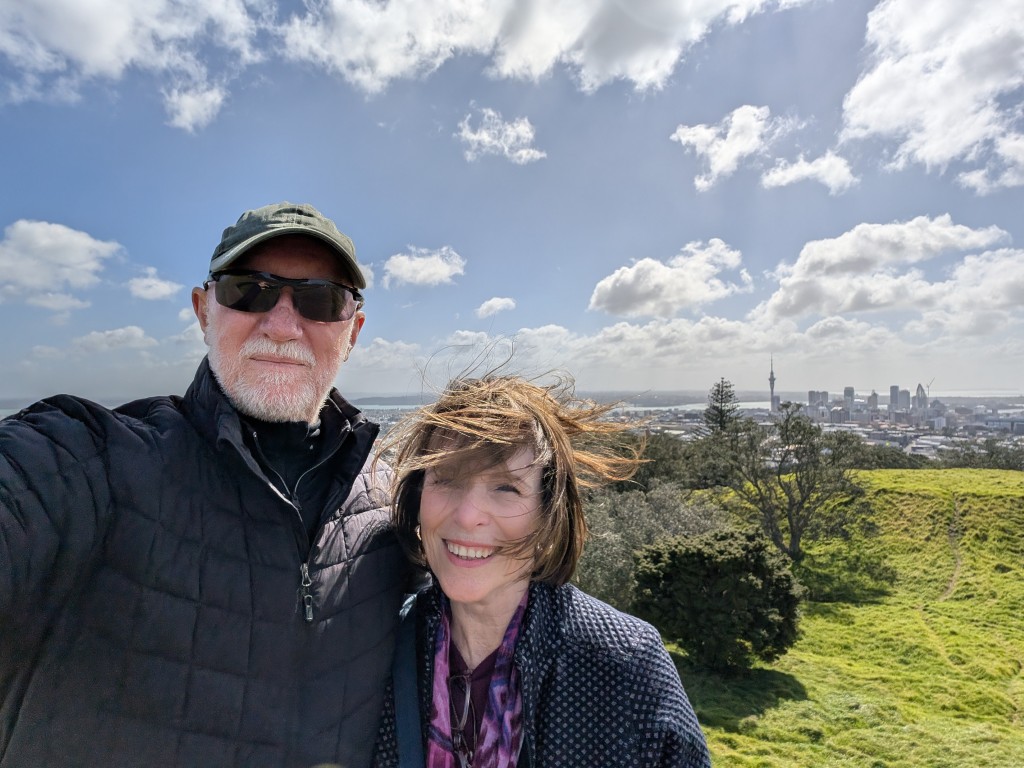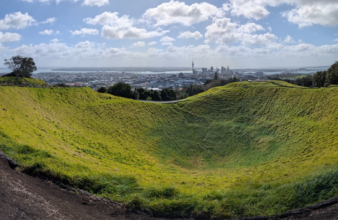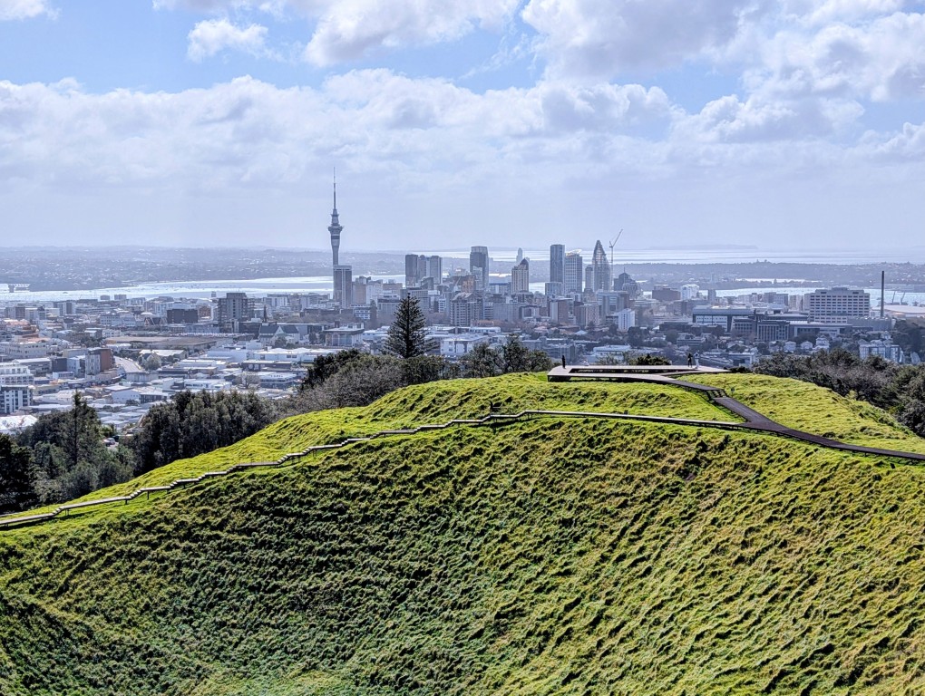 From the Domain, we drove inland to Maungawhau / Mt Eden. The name means ‘mountain of the whau tree,’ and you can feel its history as a sacred place that once served as a fortified pā for Māori communities. We parked the car and began another energetic climb to the summit—my hamstrings were really starting to complain about all the hills! At the top, a boardwalk runs around the rim of a deep crater known as Te Ipu-a-Mataaho, named for the god of earthquakes and volcanoes. It was a breathless climb, but geez, the stunning 360-degree views over the city made it absolutely worth it. The wind was blowing like crazy up there, too; my hair was a complete mess by the time we got back to the car!