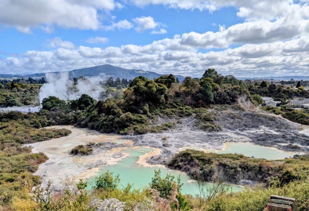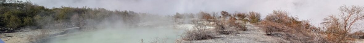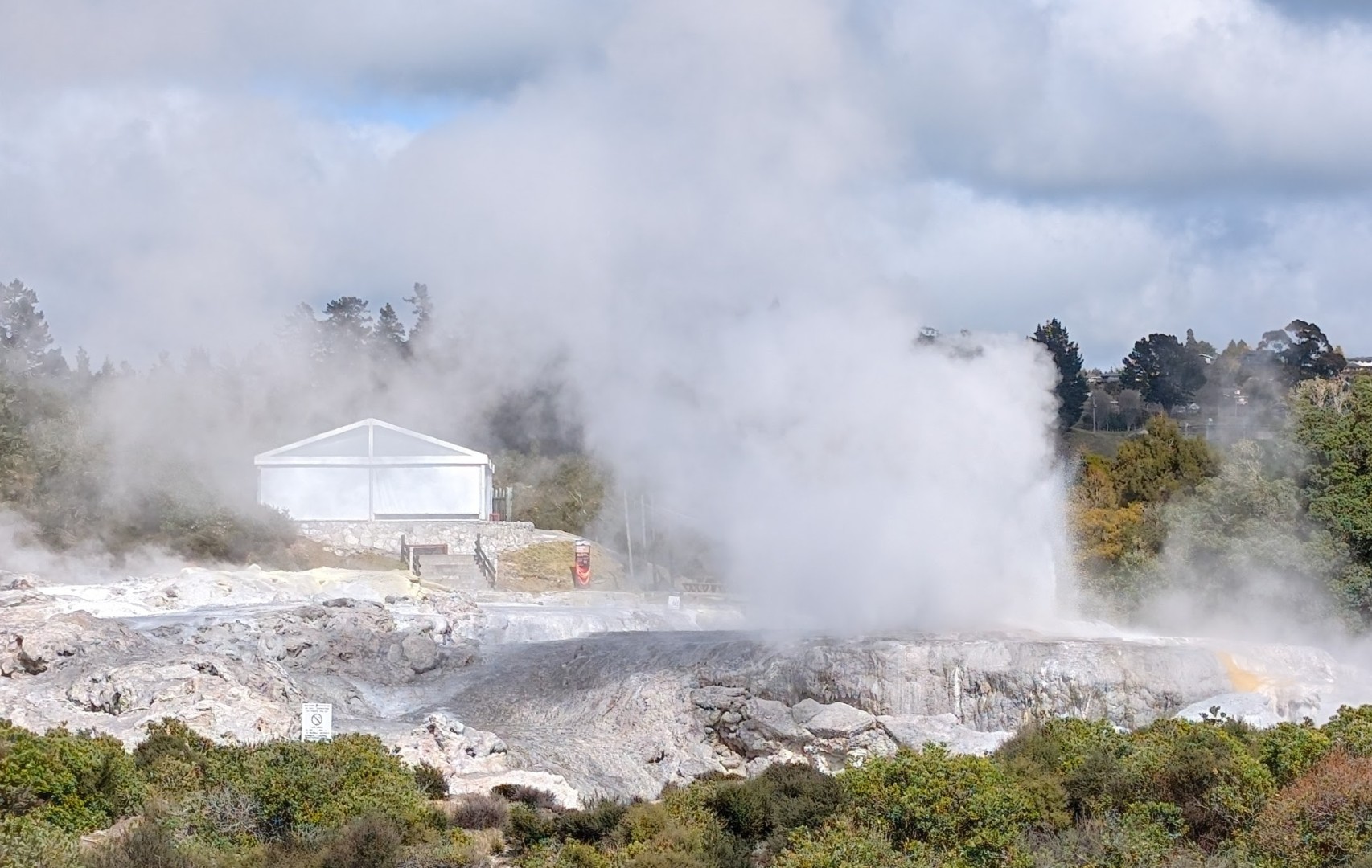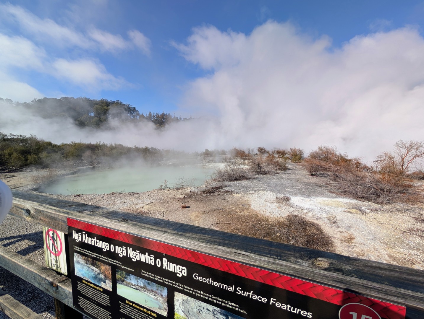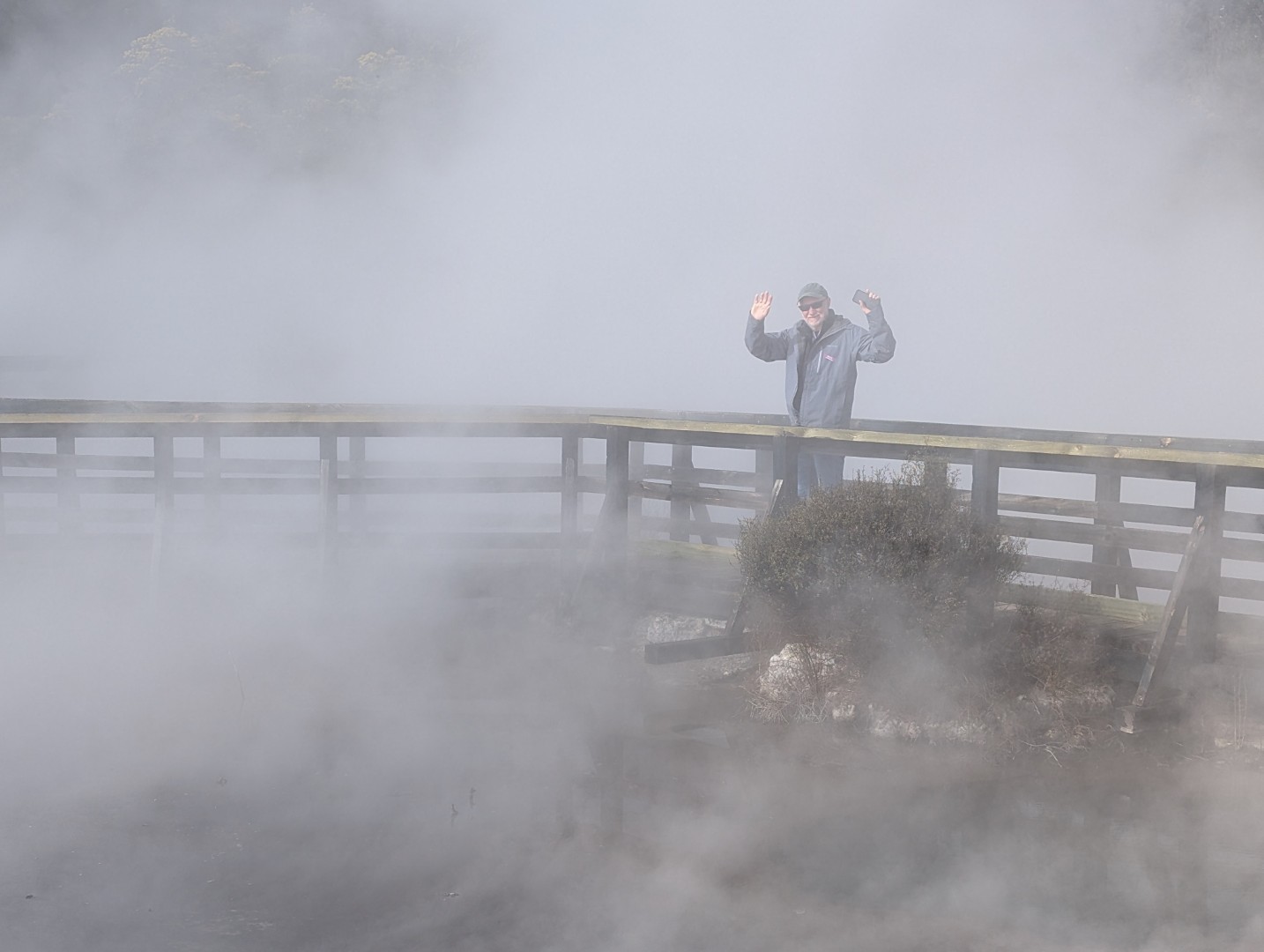 You can tell when a hotel is a little on the older side, the walls are thinner! After three very quiet nights we had some minor disturbances from neighbours last night… but luckily not excessive. Woke bright and early today to what seemed like a foggy sky over the lake, but in hindsight this was probably just the normal wintery morning steam in Rotorua! The breakfast buffet was just ok…. no mushrooms on the menu here at all!! We set out a little after 9am for the short drive to Whakerawerawera – The Living Maori Village. There are a few different places where you can explore the geothermal features of Rotorua, but I had chosen Whakerawerawera because it is the only one where you are invited to tour a village where Maori people live on a daily basis, using natural geothermal resources to cook, bathe and heat their homes as they have for centuries. We arrived and booked our tickets for the 10am tour, and used the time before the tour started to explore the lower part of the geothermal area. The steam here was abundant, at times I couldn’t even see Neil up ahead of me!