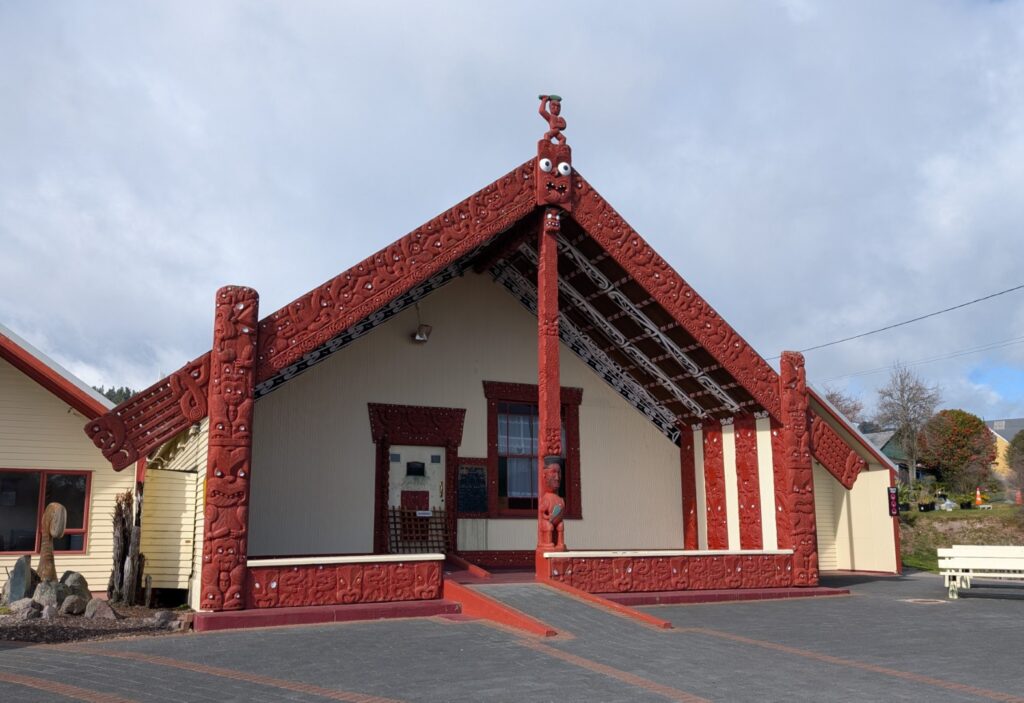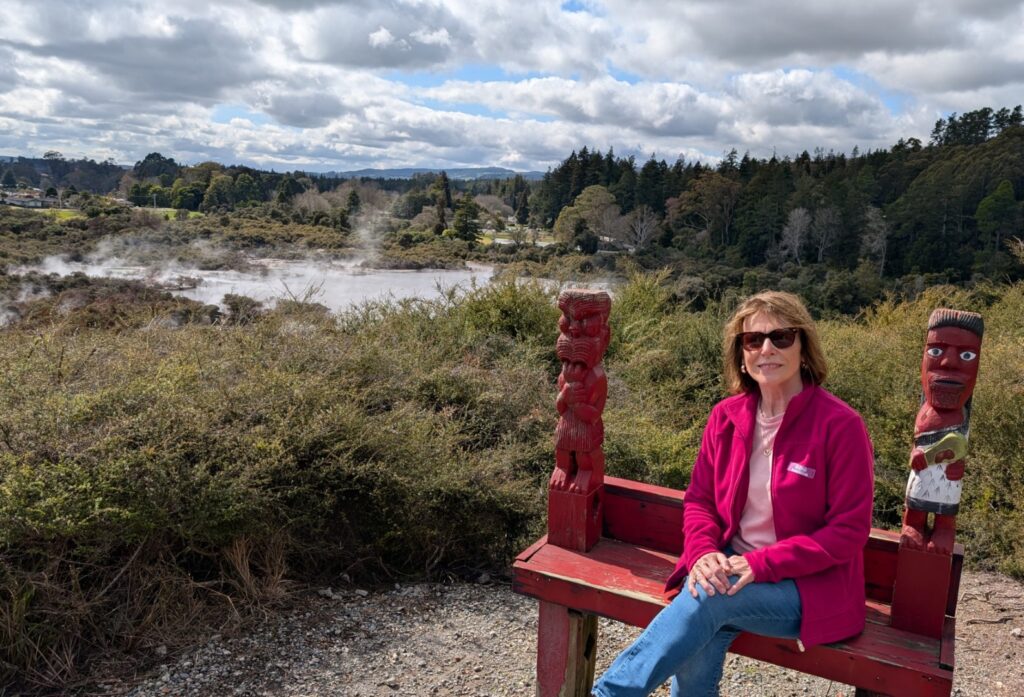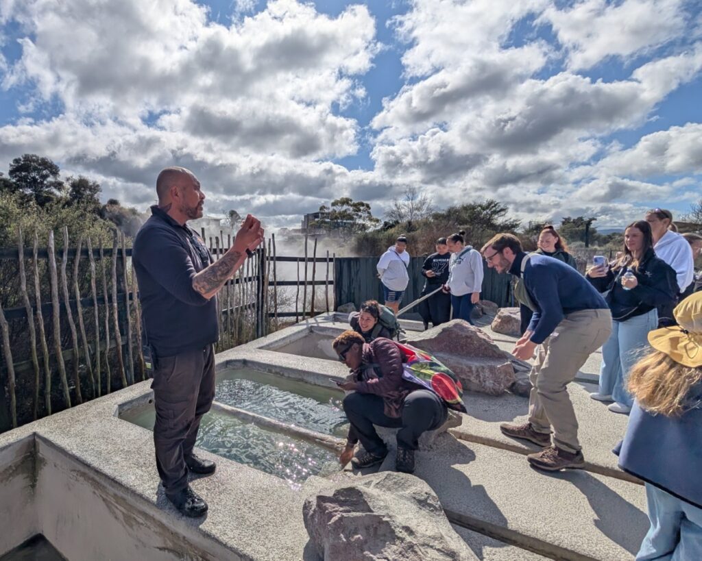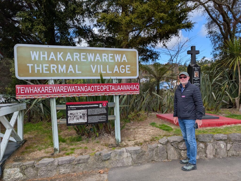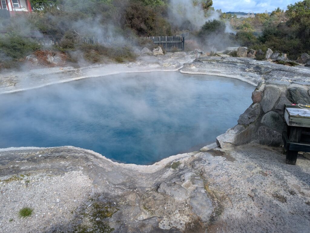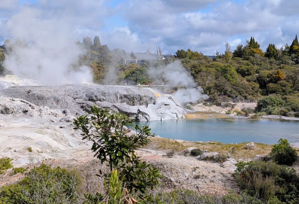 You can tell when a hotel is a little on the older side, the walls are thinner! After three very quiet nights we had some minor disturbances from neighbours last night… but luckily not excessive. Woke bright and early today to what seemed like a foggy sky over the lake, but in hindsight this was probably just the normal wintery morning steam in Rotorua! The breakfast buffet was just ok…. no mushrooms on the menu here at all!! We set out a little after 9am for the short drive to Whakerawerawera – The Living Maori Village. There are a few different places where you can explore the geothermal features of Rotorua, but I had chosen Whakerawerawera because it is the only one where you are invited to tour a village where Maori people live on a daily basis, using natural geothermal resources to cook, bathe and heat their homes as they have for centuries. We arrived and booked our tickets for the 10am tour, and used the time before the tour started to explore the lower part of the geothermal area. The steam here was abundant, at times I couldn’t even see Neil up ahead of me!