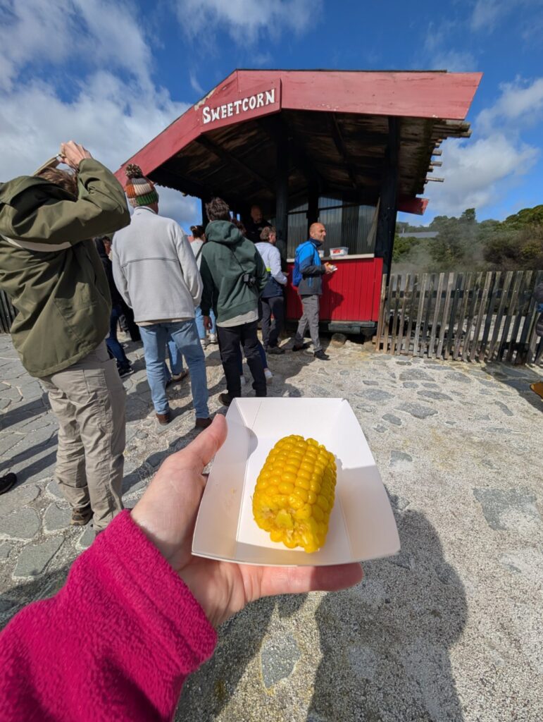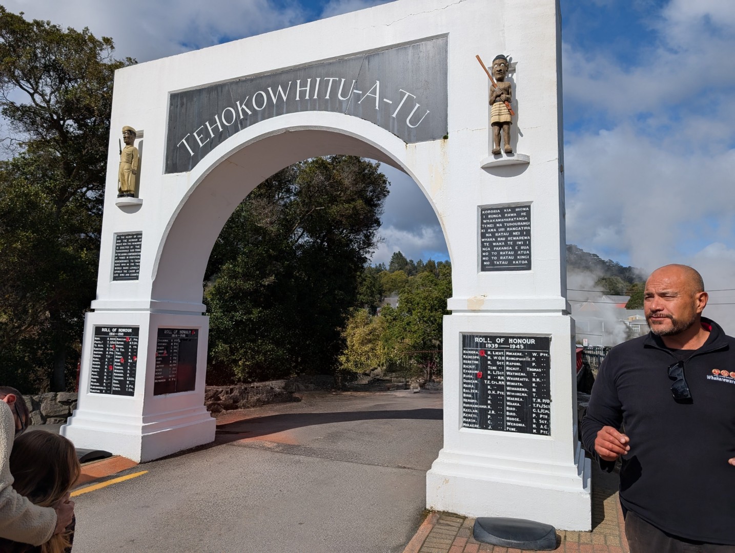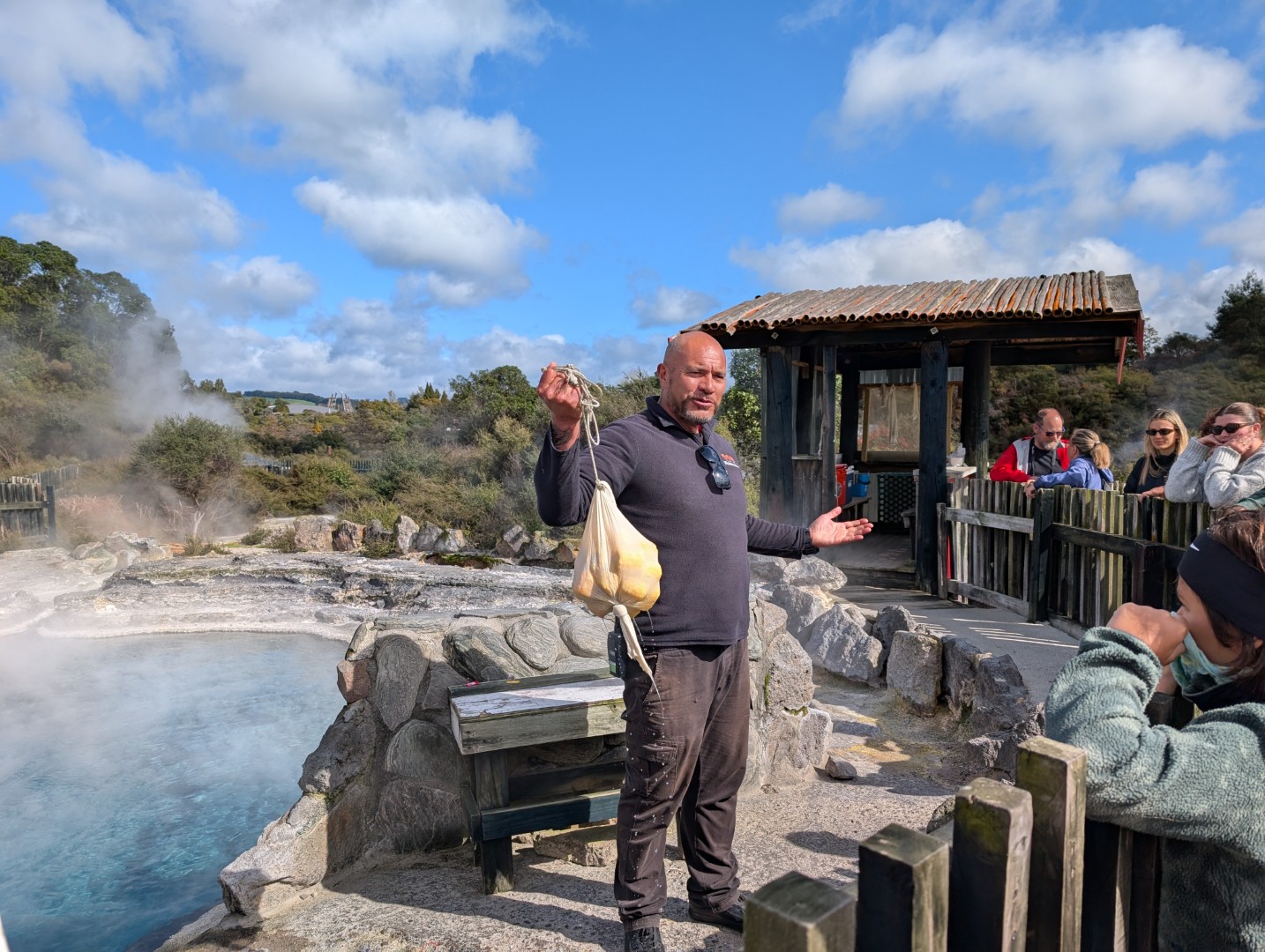 Promptly at 10am, our guide Daniel welcomed us very warmly to the village. He first talked about the start of tourism in New Zealand – which began in the early 1800s at the Pink and White Terraces in a village a short distance from New Zealand. Not long after that, the people of his village in Rotorua started guiding visitors around their village. He took us through the gate to the village, which is actually a war memorial and into the communal area where the families use the geothermal heat to cook their meals. They use covered hot boxes to cook meats and casseroles and to bake bread etc and they have a large boiling pool which they use to cook vegetables. To demonstrate he dragged a muslin cloth bag from the boiling pool and opened it to serve us all some very tasty and beautifully cooked sweet corn.