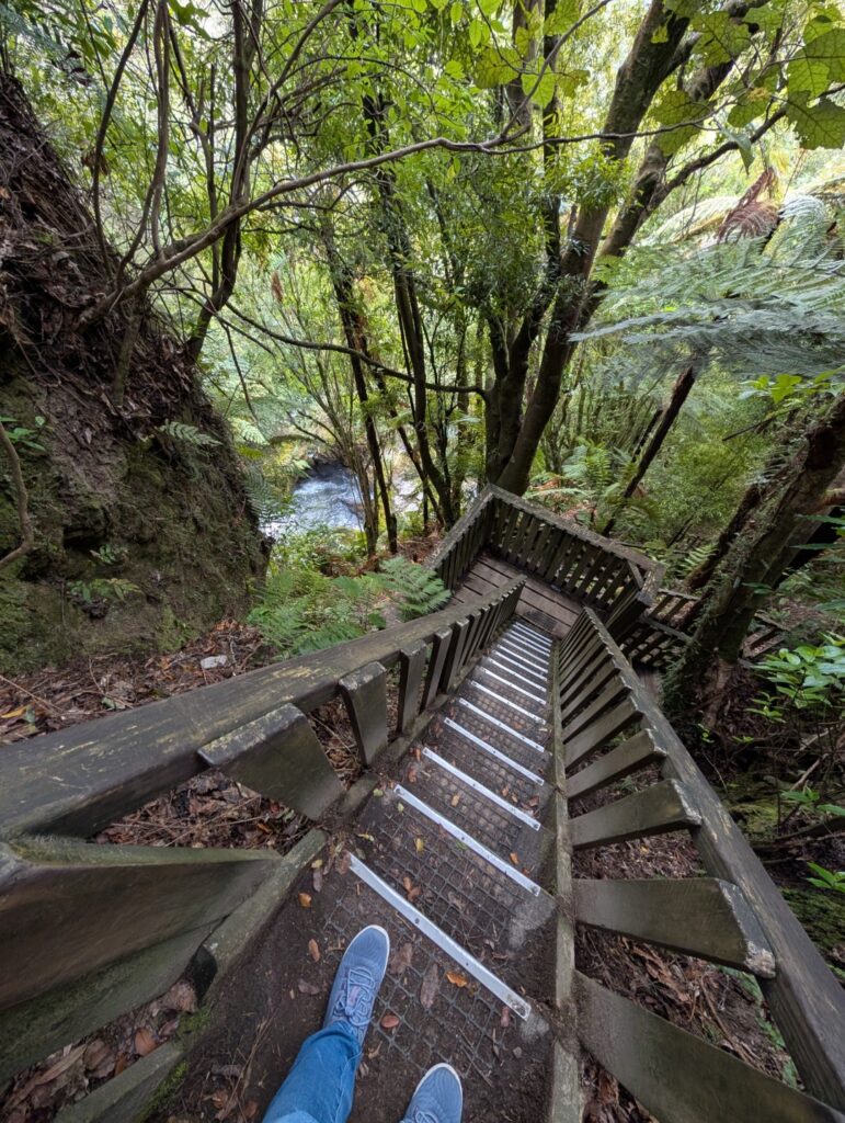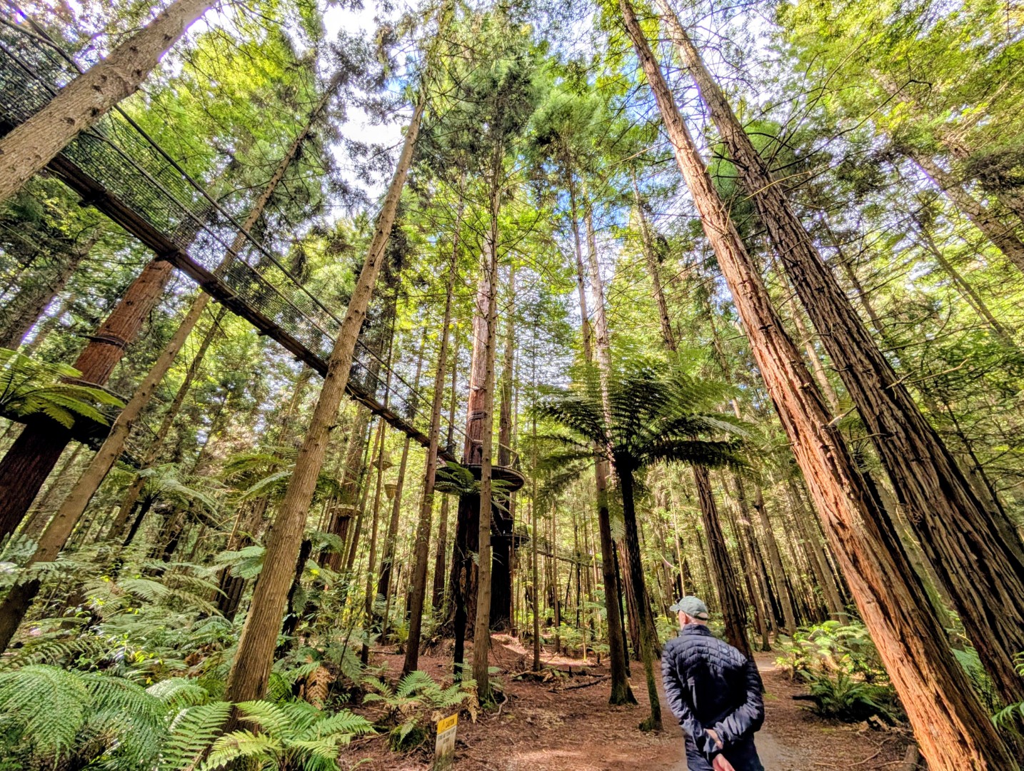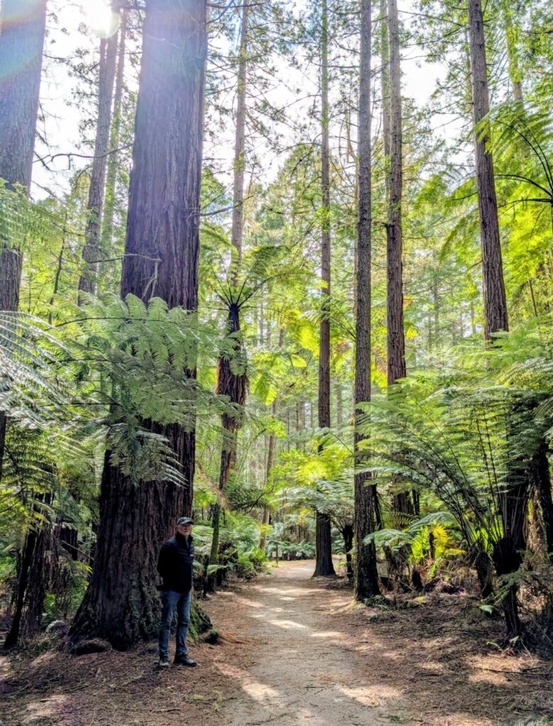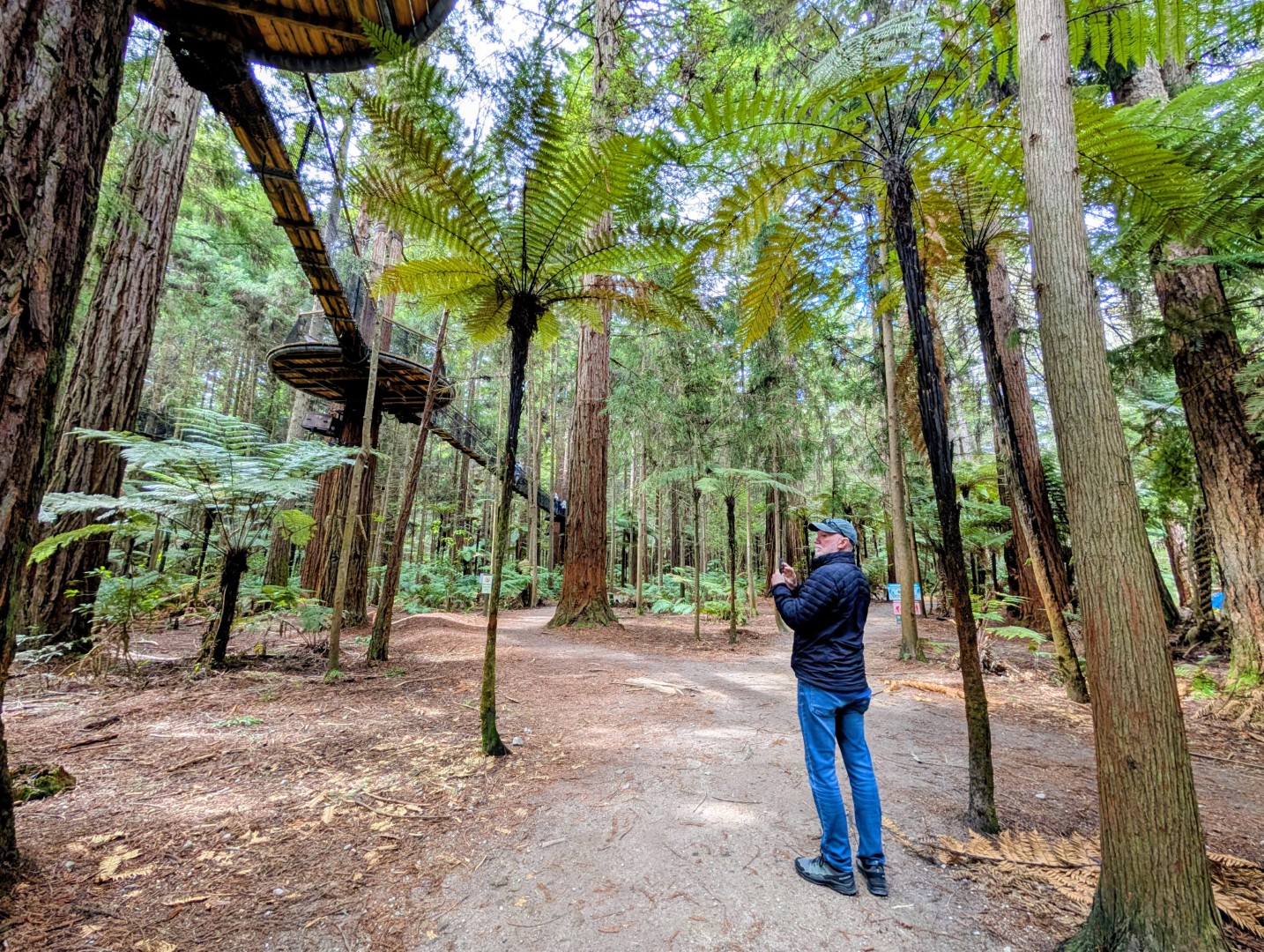 It was only a short drive from Whakerawerawera to the Redwood Memorial Grove that was our next item on the touring list for today. This huge forest of Californian Redwoods was planted in 1901, and they are now spectacularly tall with lovely undergrowth of native tree ferns and palms. The area is criss-crossed with walking trails and there is also a very popular “Treewalk” which is slung way up in the canopy. We were content to stay at ground level and really enjoyed a wander along one of the forest paths.