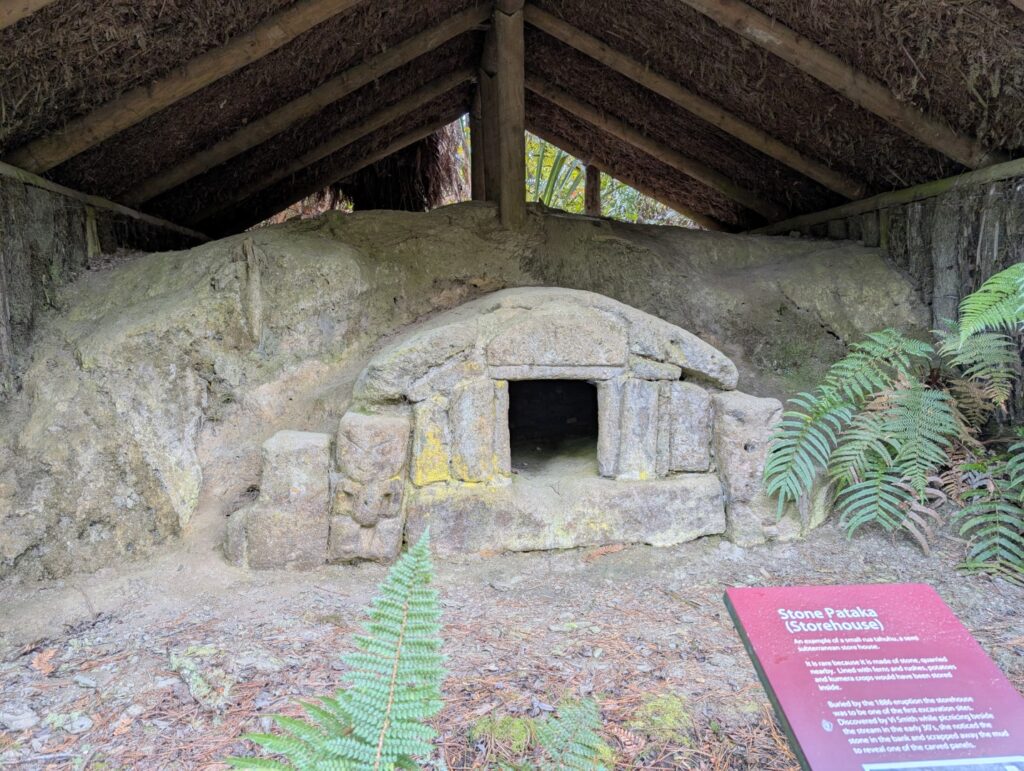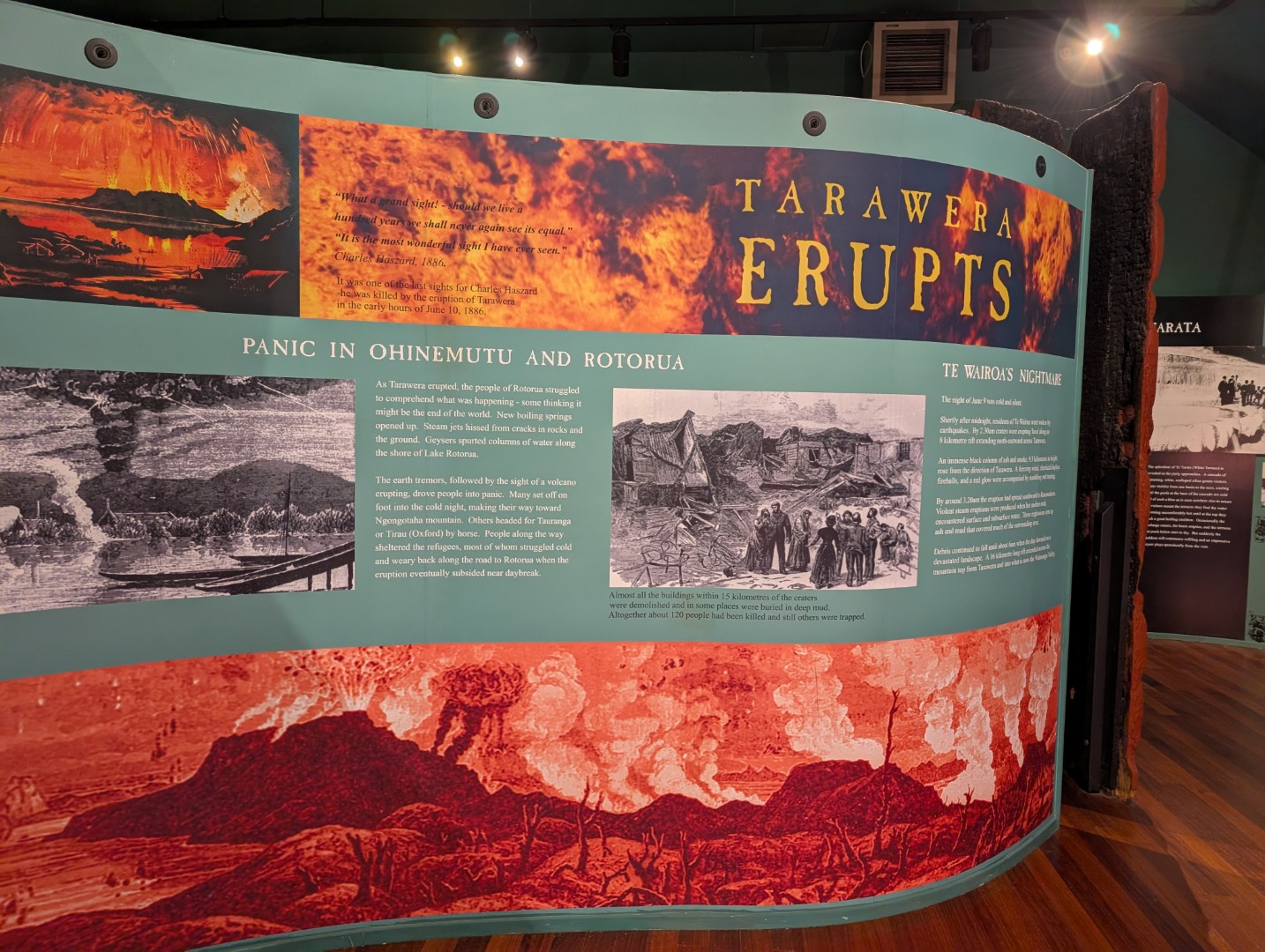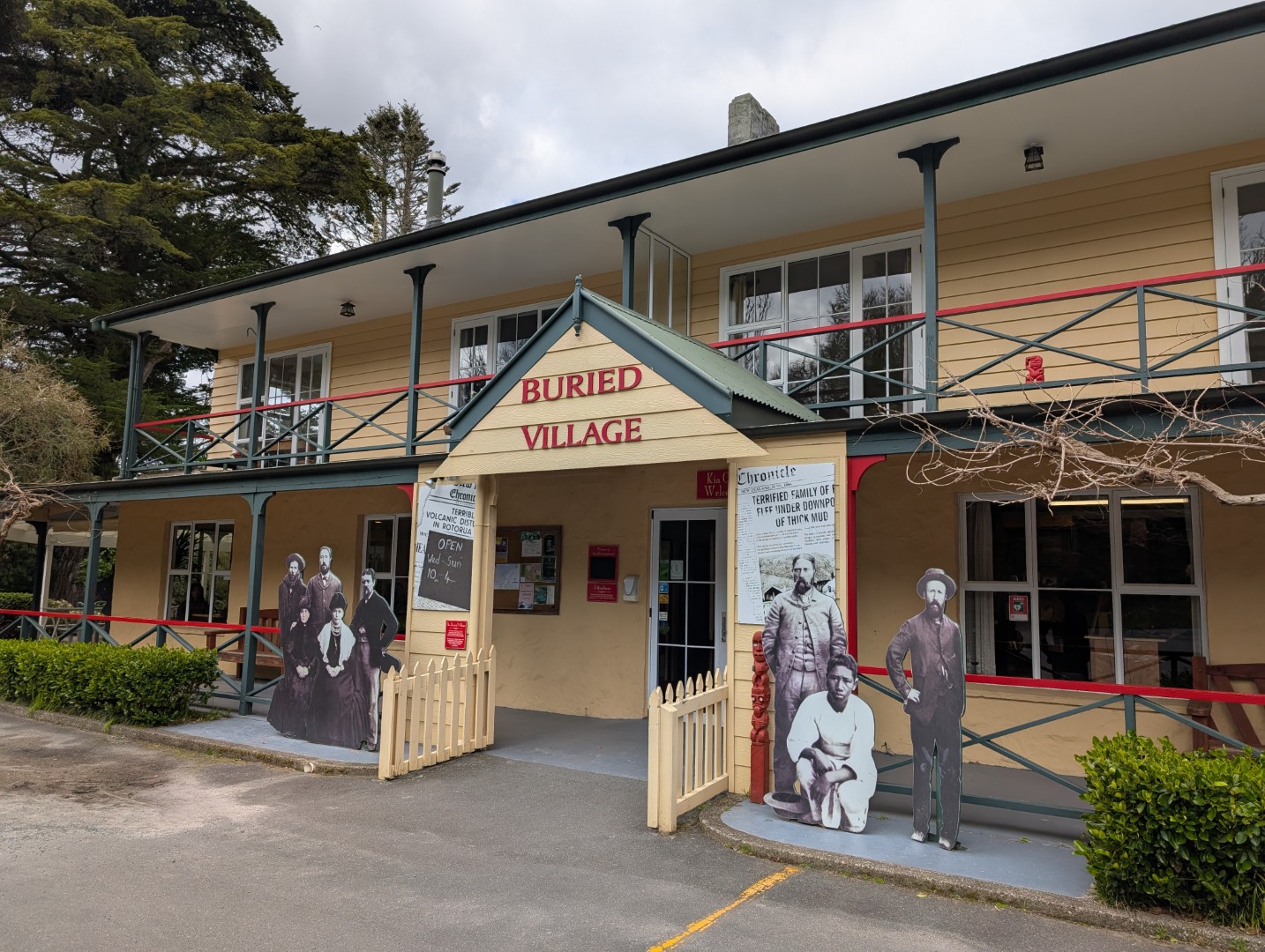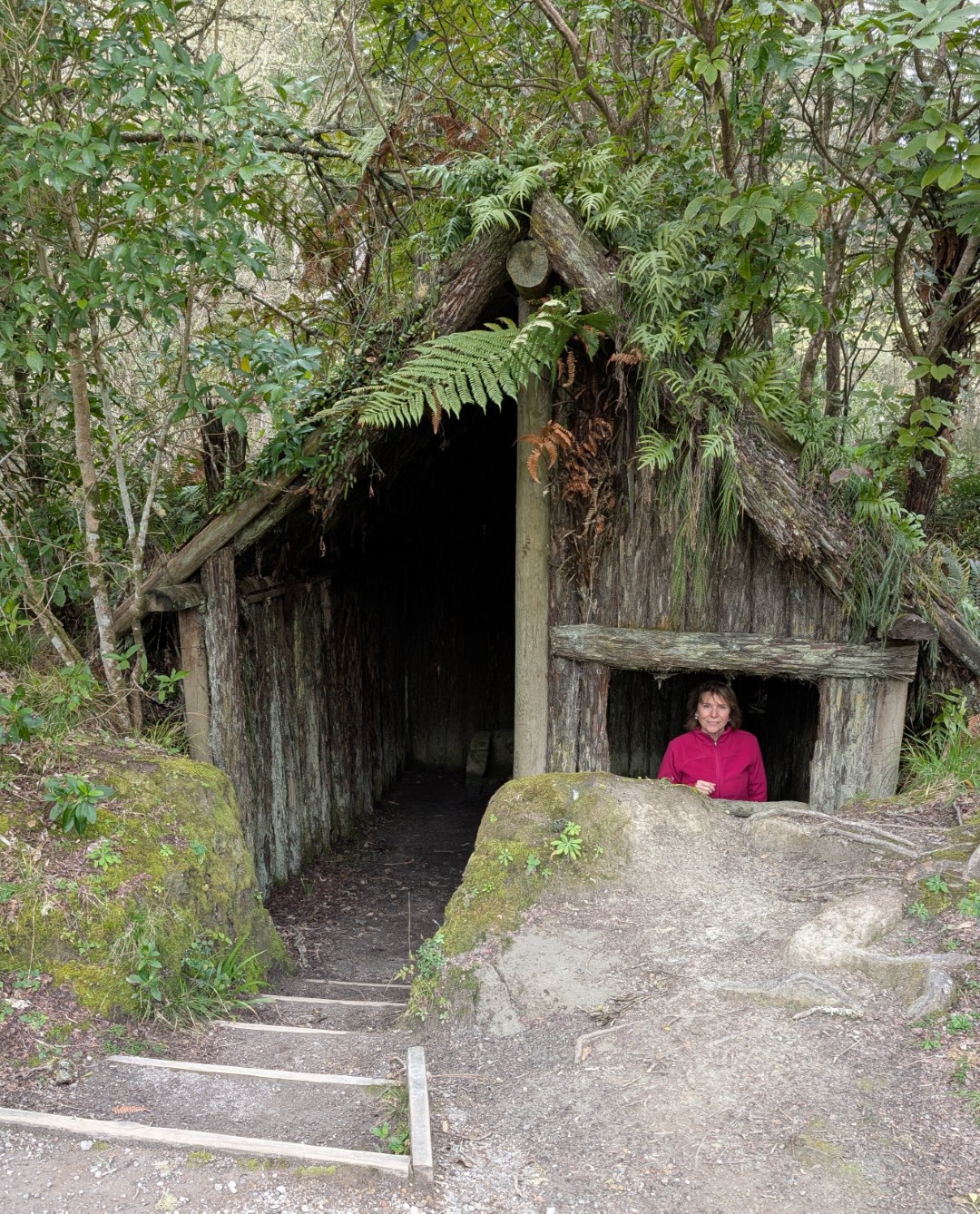 After our “forest bathing” we drove further out of the city for around 15km to reach the Buried Village of Te Wairoa, which was once the place from which people could be taken to see the Pink and White Terraces. These were a spectacular geological formation of silica and mineral deposits , considered by many to be the “eighth wonder of the world”. Formed over centuries by geothermal waters rich in silica, they cascaded down the landscape, creating tiered steps and pools that attracted tourists from around the globe. This natural wonder was tragically destroyed on June 10, 1886, when the Mount Tarawera eruption buried them under volcanic material. When the mountain erupted it also buried the little village of Te Wairoa in a layer of mud, destroying it completely, and killed 120 people. Later, mostly in the 1930’s , parts of the village were excavated by archeologists and there is now an excellent museum which tells the story of the eruption and the later discoveries by archeologists.