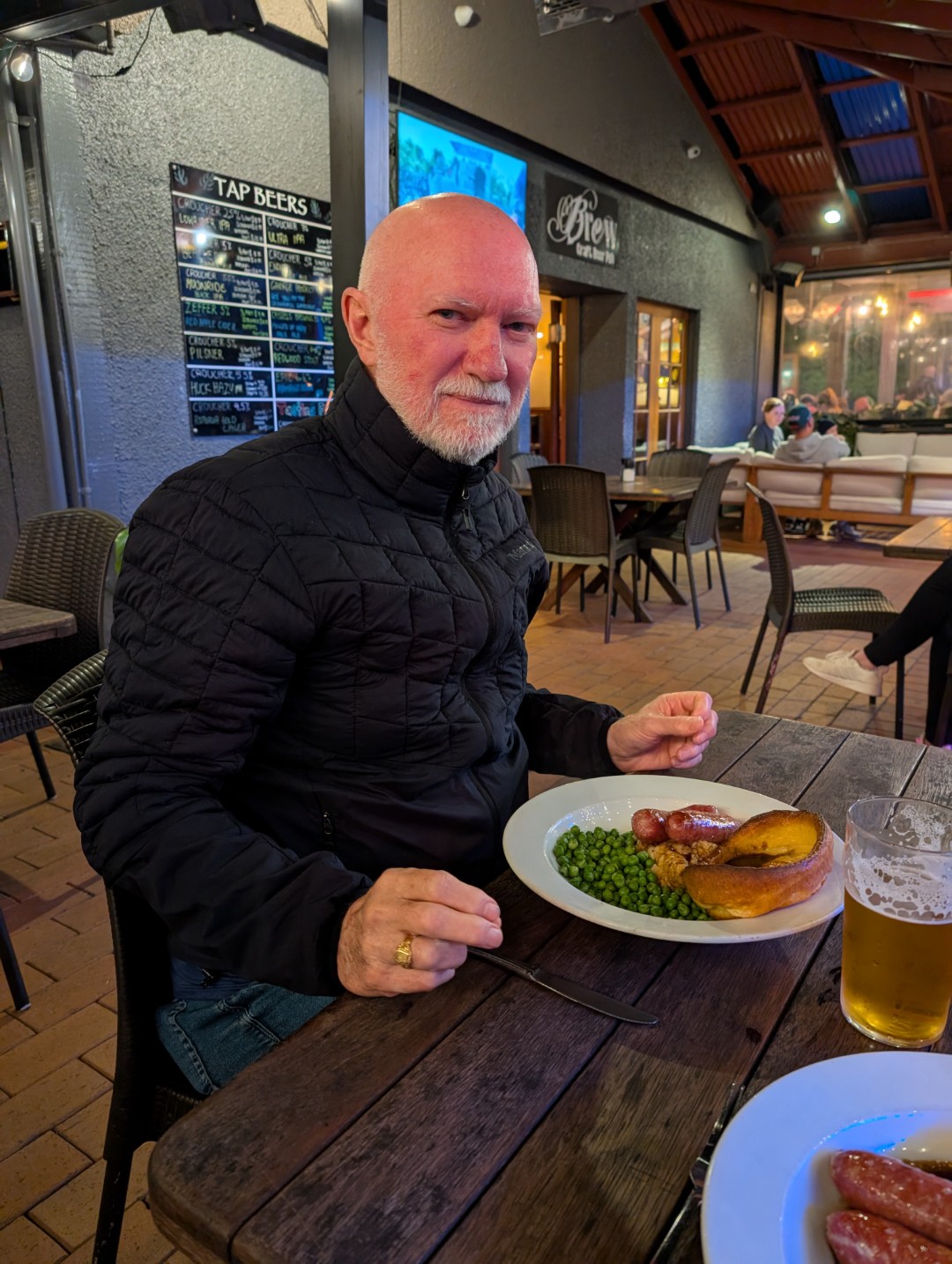 Back at the hotel we had to deal with some laundry, before we set out down into the town to find a spot for dinner. Tonight we chose the Brew Craft Beer Pub. They had the requisite selection of craft beer for Neil and a very nice selection of options on the menu – we both went for the Bangers and Mash with peas and Yorkshire pudding – delicious! On the way back to the hotel we walked through the stalls of the Night Food Market, which takes over the main street every Thursday night. It looked very popular and had an interesting mix of food trucks, but we were glad we’d selected our pub.