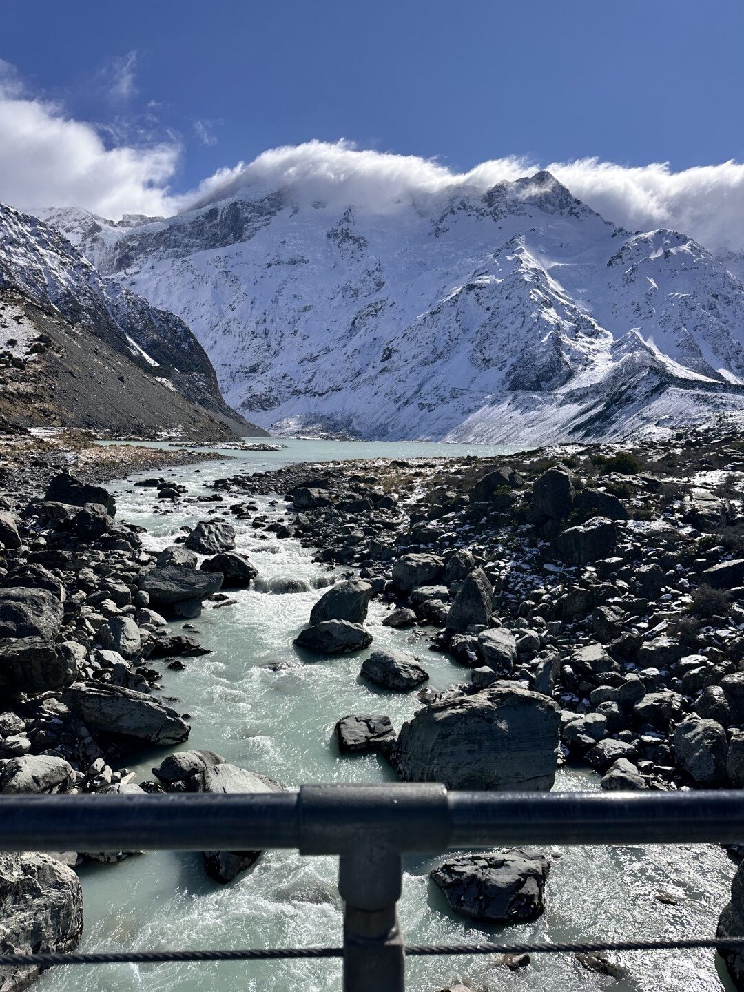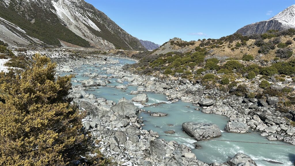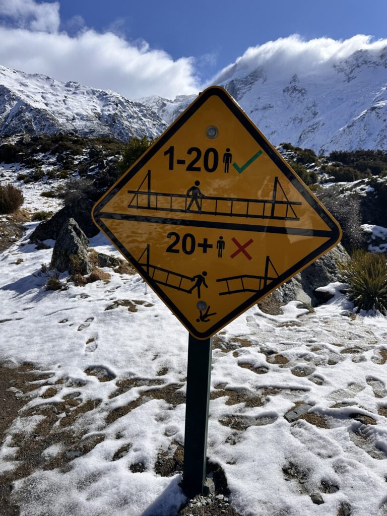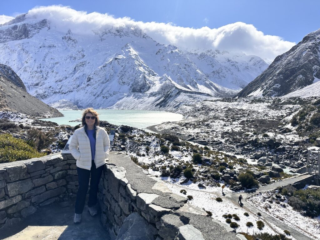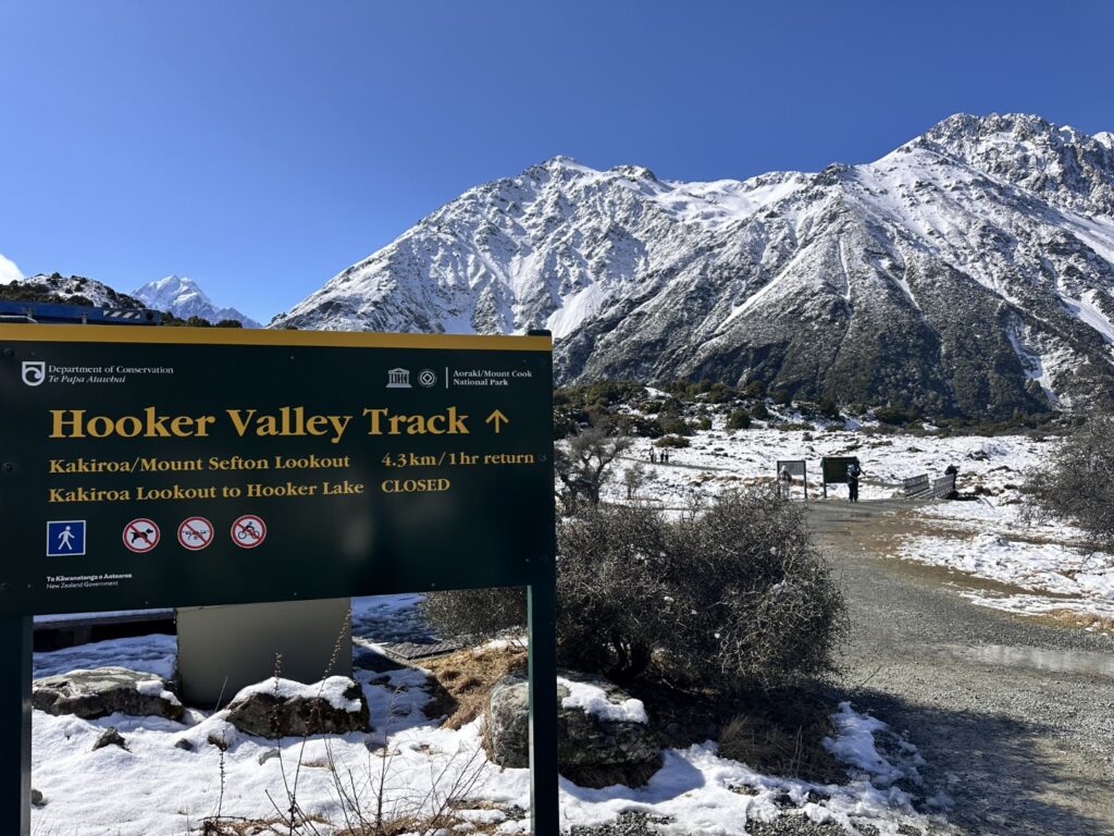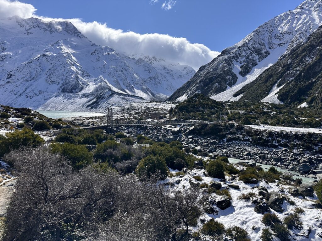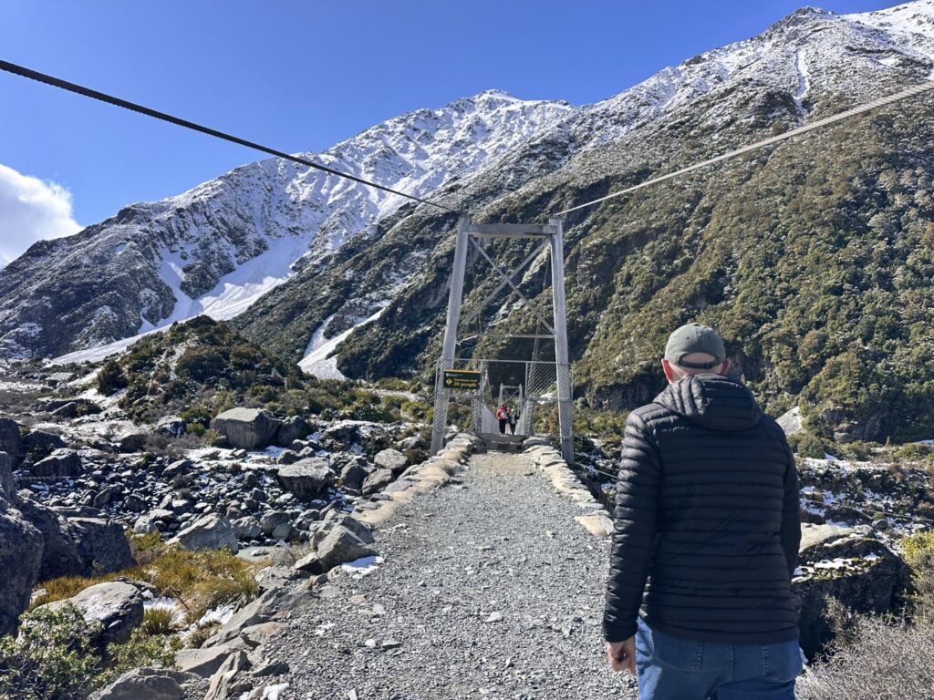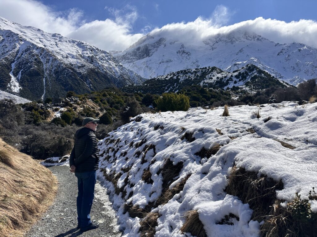 I’d planned for us to do a couple of hikes here , weather permitting. The weather was certainly permitting today so we drove to the parking lot for the trailhead of the Hooker Valley Track. The Hooker Valley Track is constantly voted New Zealand’s Best Day Walk since it offers a beautiful view of the New Zealand Southern Alps. Unfortunately a long section of the track is currently closed for maintenance, so we would only be able to walk to the first swing-bridge. The snow lay on the ground all the way to the trailhead and on the pathways and hillside as we walked. In places it was very icy and slippery , so you really needed to watch your step.