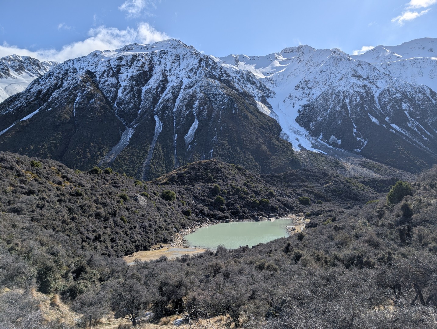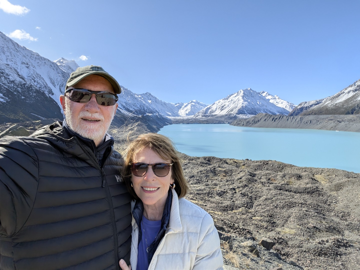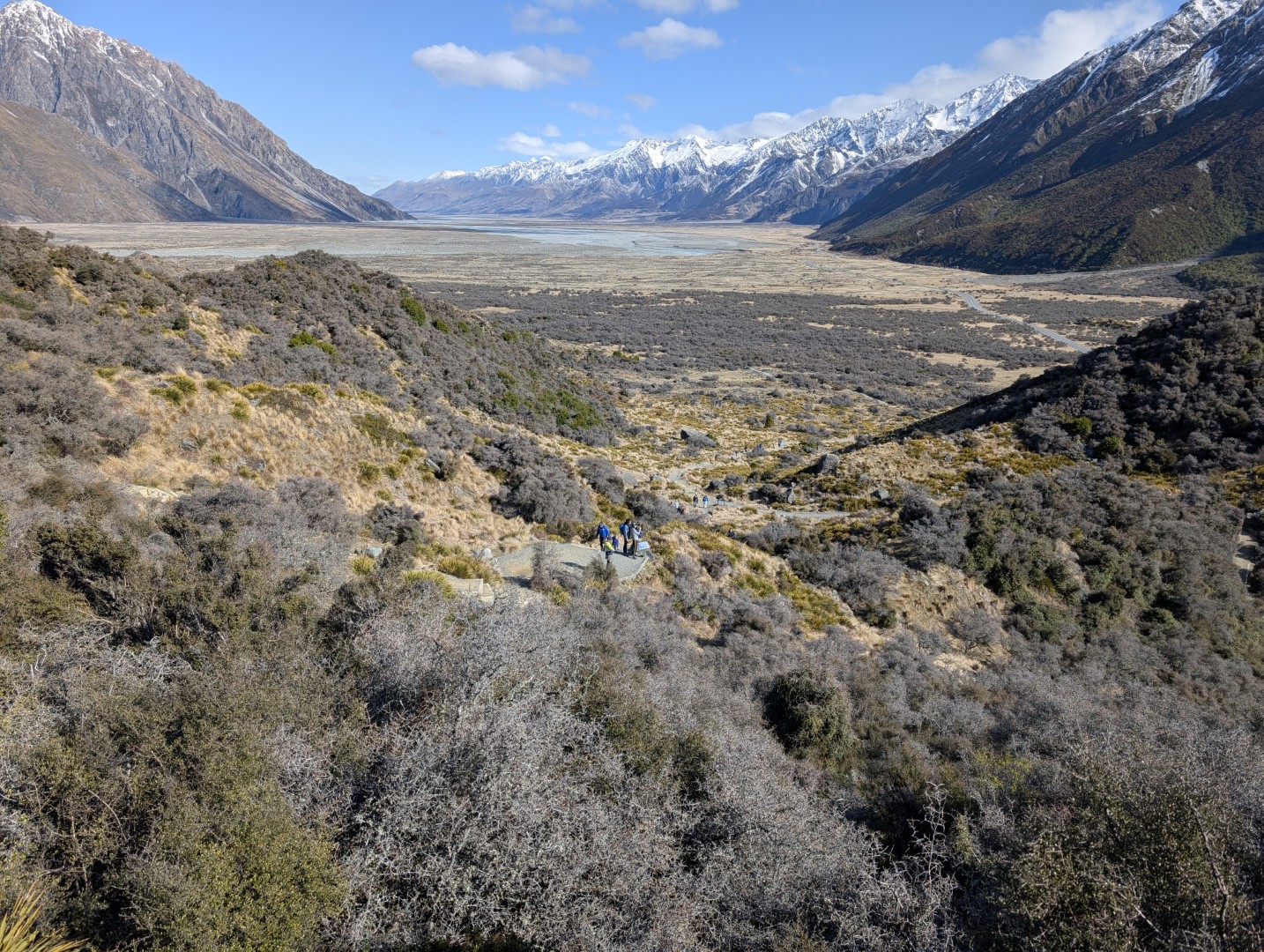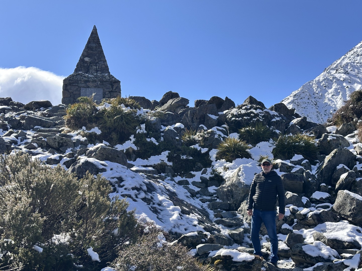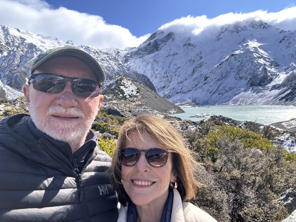 I’d planned for us to do a couple of hikes here , weather permitting. The weather was certainly permitting today so we drove to the parking lot for the trailhead of the Hooker Valley Track. The Hooker Valley Track is constantly voted New Zealand’s Best Day Walk since it offers a beautiful view of the New Zealand Southern Alps. Unfortunately a long section of the track is currently closed for maintenance, so we would only be able to walk to the first swing-bridge. The snow lay on the ground all the way to the trailhead and on the pathways and hillside as we walked. In places it was very icy and slippery , so you really needed to watch your step.
