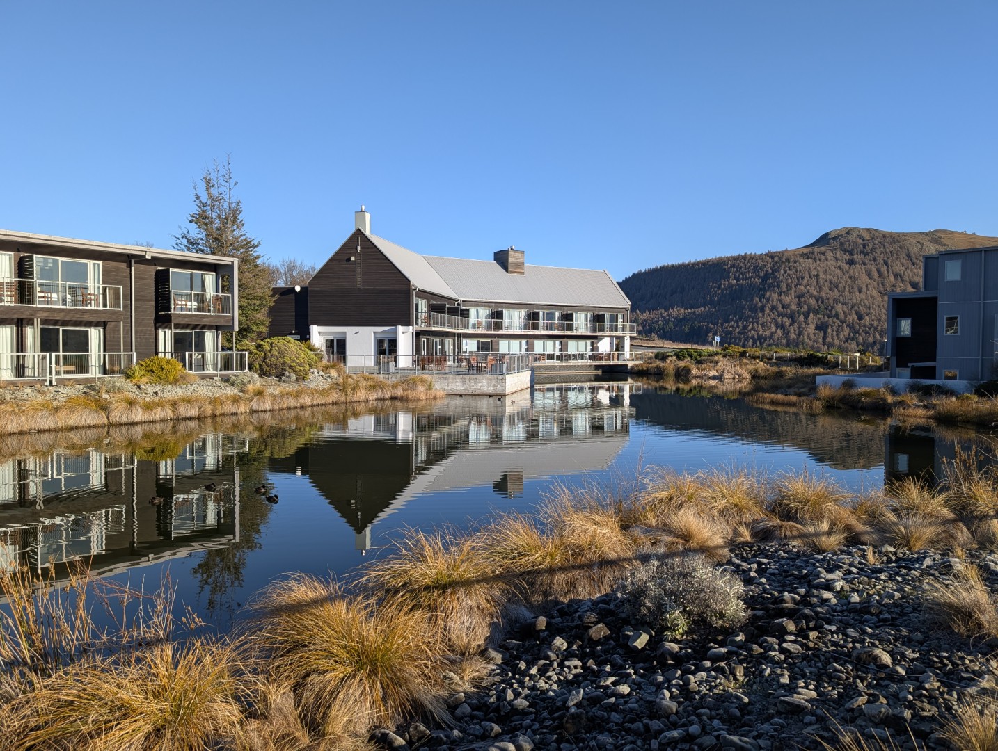 We were delighted to open the blinds this morning when we woke. The sun was shining and there wasn’t a single cloud in the sky! It was very chilly though, around 3 degrees, so we put our down jackets on for the walk to the restaurant for breakfast. On the way I took a couple of shots of the reception area, which has it’s own little lake; and the view up the lake from the terrace in front of the restaurant.