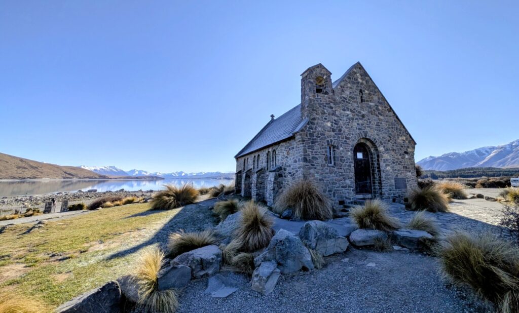 After we checked out we backtracked a little along the lake to see one of the main tourist sights in Lake Tekapo, The Church of the Good Shepherd. We had stopped here on our visit to NZ in 2001 and I remembered what a gorgeous setting the tiny church has. Since then they have built a fence around it and the grounds are only accessible in daytime hours. We enjoyed walking around it and remembering our visit with the kids so long ago. There really can be few churches with a more beautiful setting.
