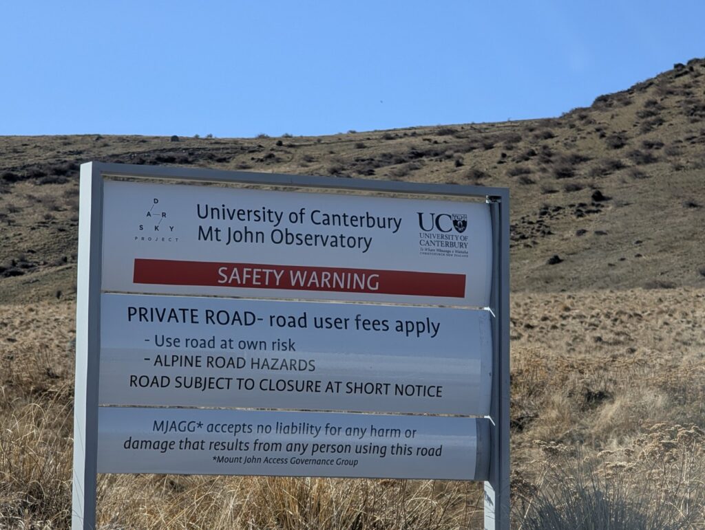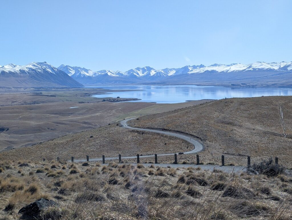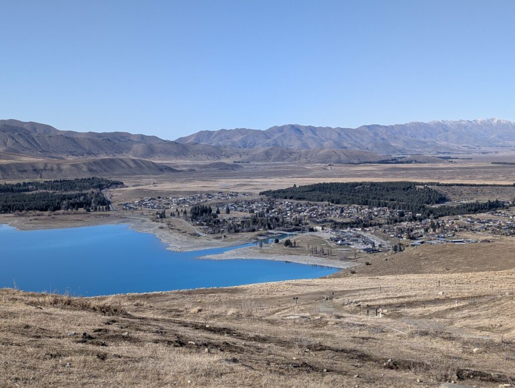 We were still pinching ourselves with our good luck with the weather today. Not only was the sun shining but there was barely any wind. We set off down the road from the town and then turned up the side road that leads to the Mt John summit. The private road to the summit only opened at 10 am and we were a little early so we waited in a short queue for 10 minutes until they opened the gate and allowed us in. Mount John offers an incredible vantage point with a 360-degree view of the nearby mountains, lakes, and flatlands of the Mackenzie Basin. The summit is also the home of New Zealand’s only professional research observatory, in the heart of the Aoraki Mackenzie International Dark Sky Reserve. In fact, it’s the southernmost facility of its kind in the world. It was steep drive up but the view from the summit was spectacular. The cafe had just opened and there were already people sitting down to enjoy a coffee. We were content to just wander around and admire the view and count the rabbits, there were many of those little guys running around up there!