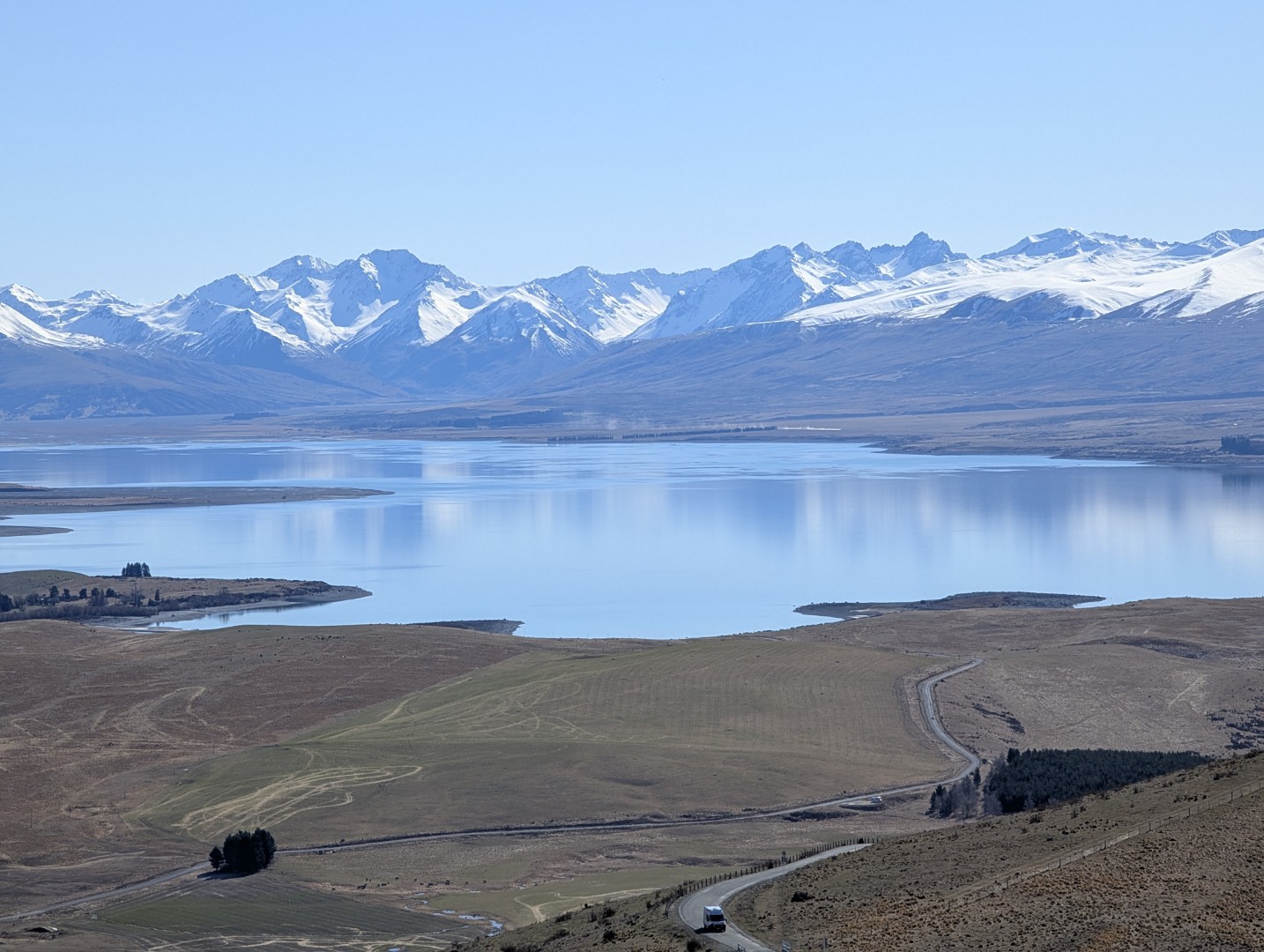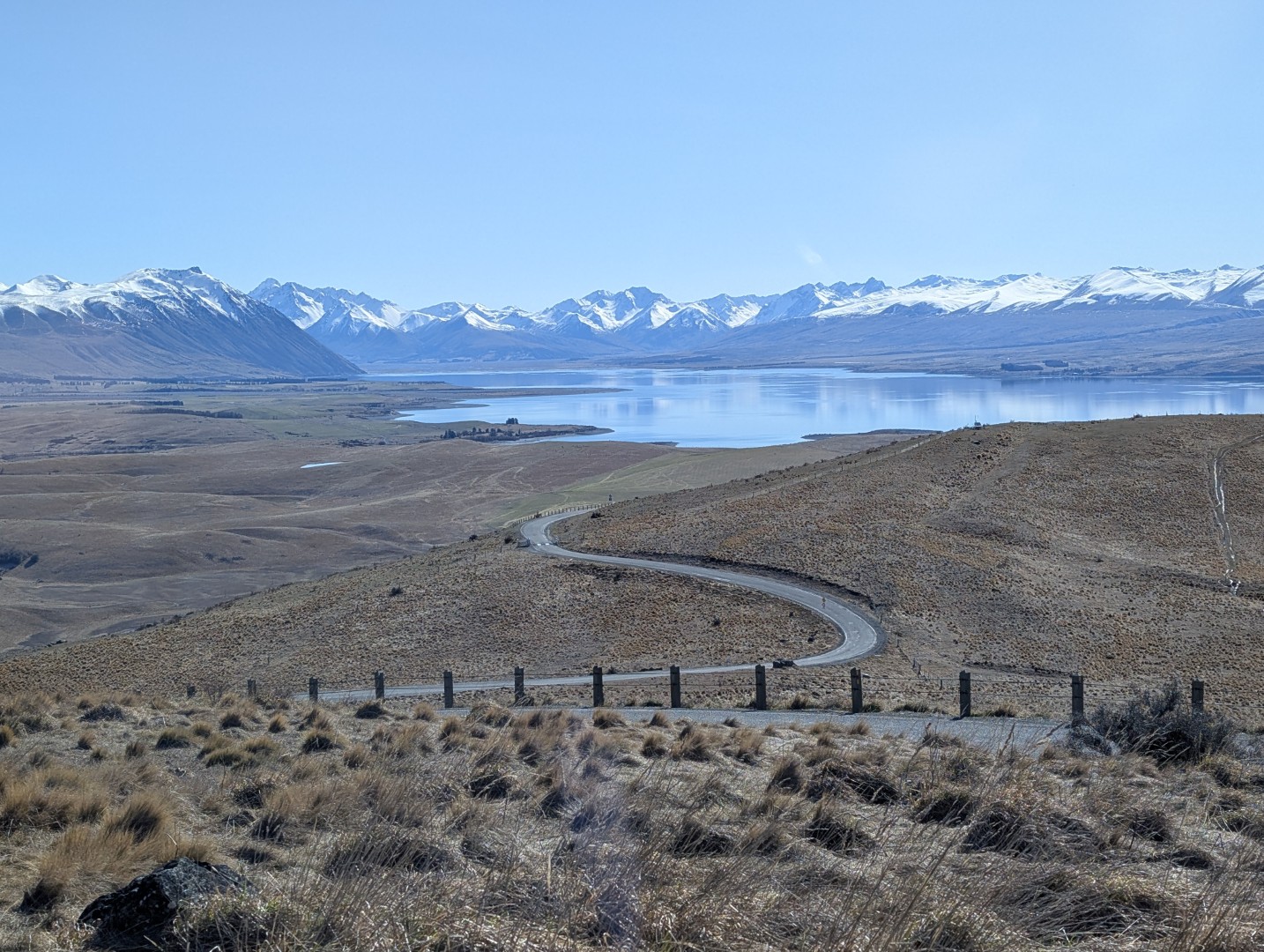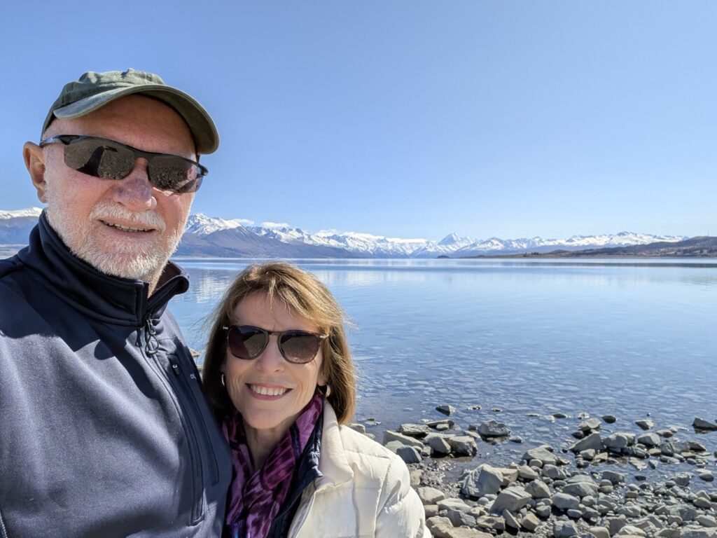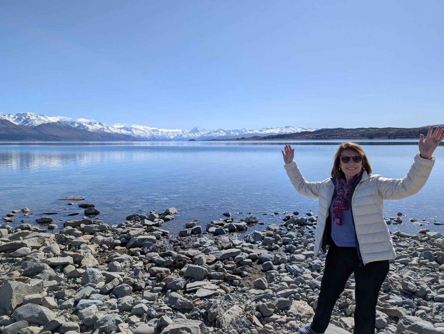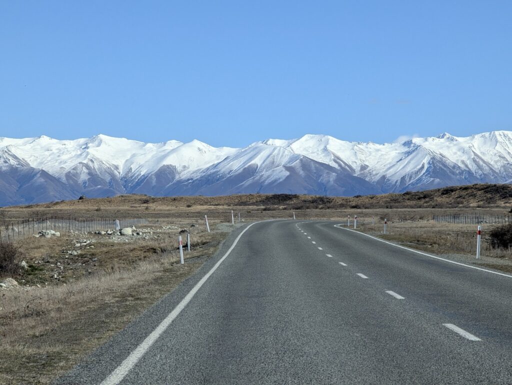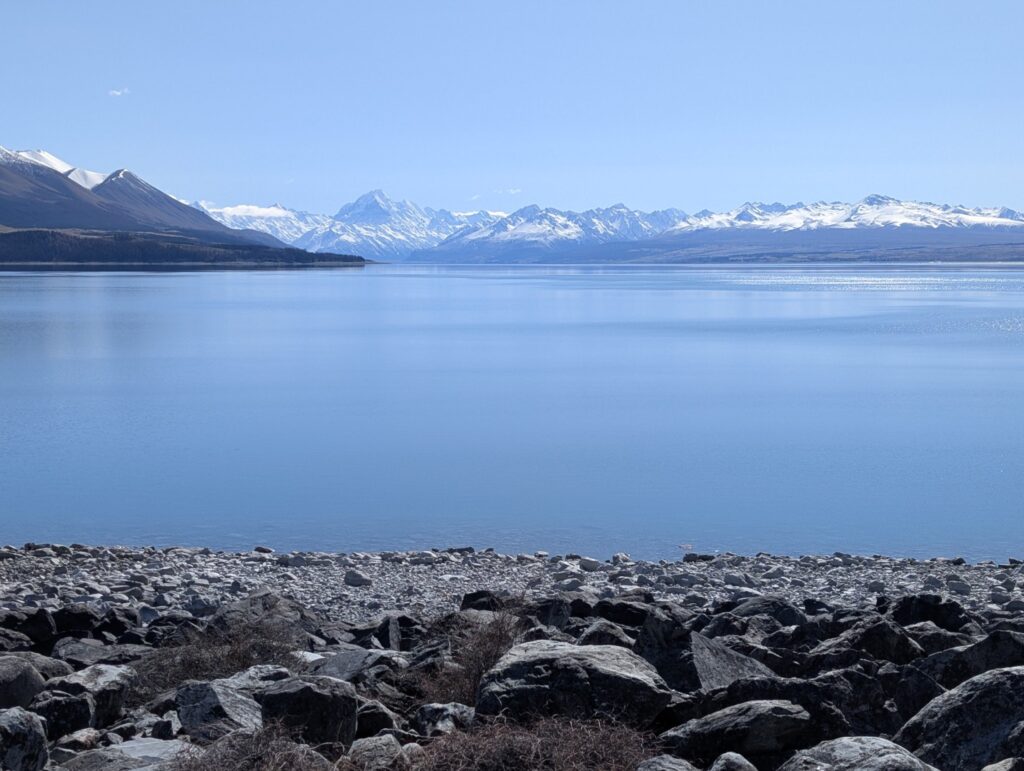 Once back down we set off toward Lake Pukaki, another simply stunning alpine lake. The scenery along the road was glorious – wide, brown land with the snow capped mountains surrounding us as far as the eye could see. At the first Lake Pukaki viewpoint we walked all the way down to the water, across a very wide beach of tumbled stones. From here we could see Mt Cook in the distance at the top of the Lake.