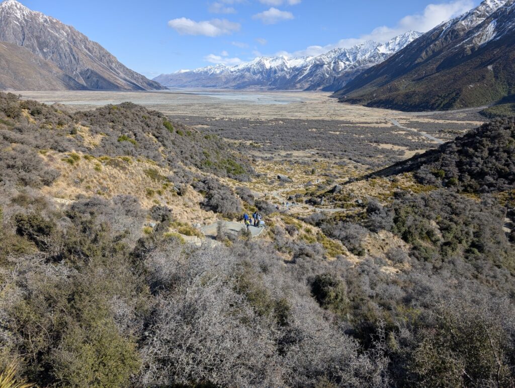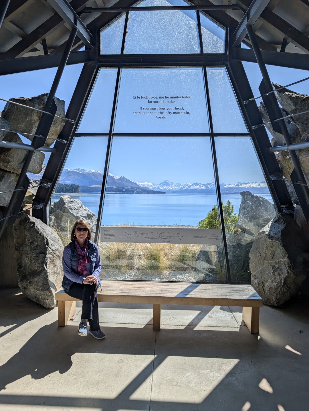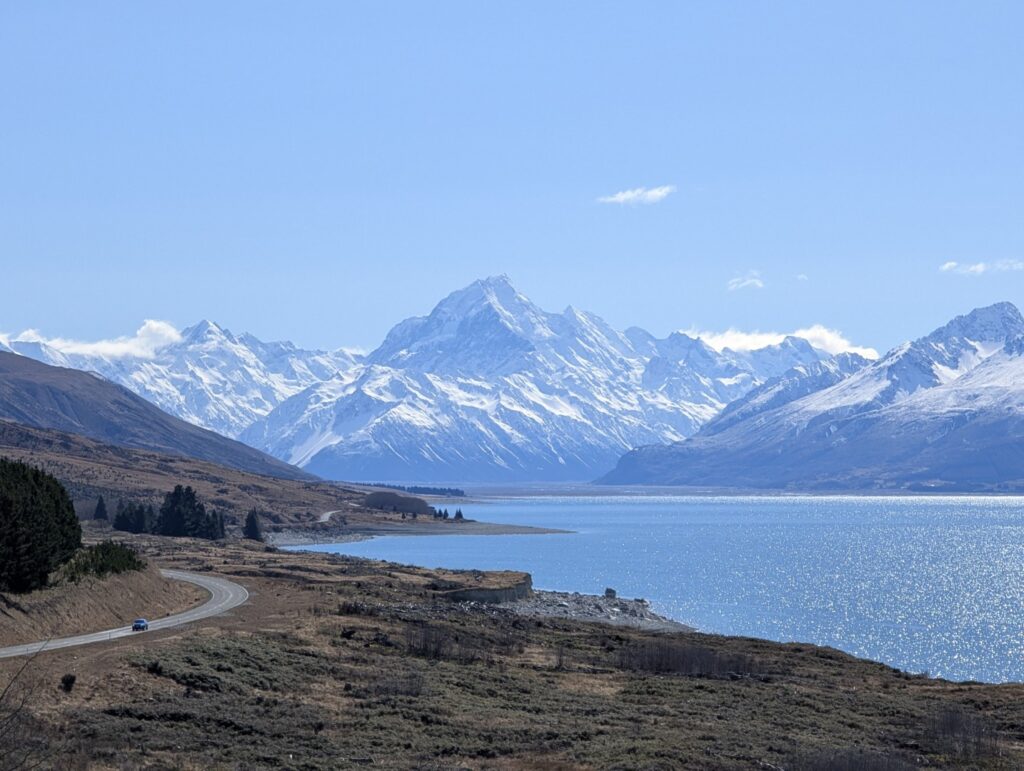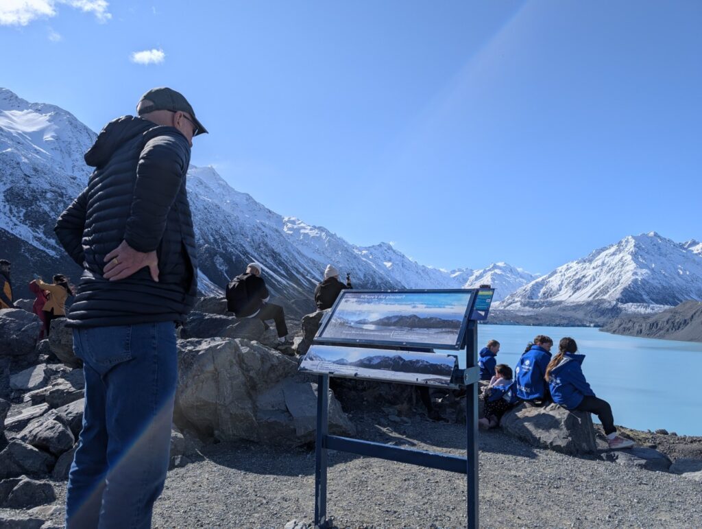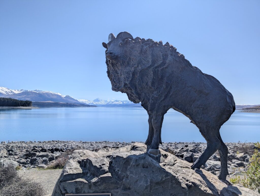 A little further around the lake we stopped in at the Punatahu Visitor Centre. It offers visitors information about the area’s natural and cultural history, including exhibits on local flora, fauna, and Maori heritage. The center had a covered seating area with panoramic views of Mount Cook, providing a great spot to sit and contemplate the scenery. Adjacent to the visitor center is a life-sized bronze statue of a Himalayan Tahr, commemorating the species introduced to New Zealand in the early 20th century.