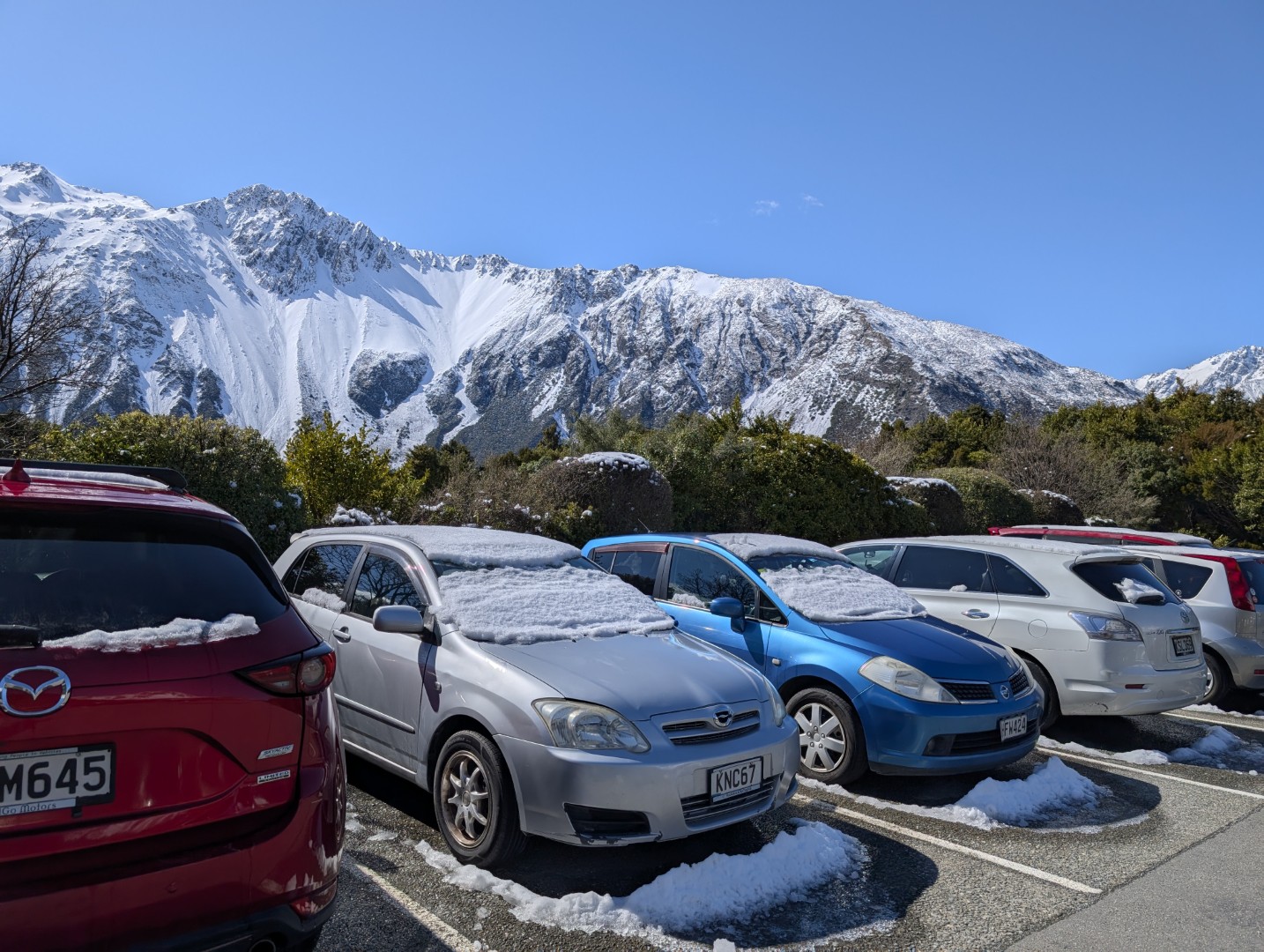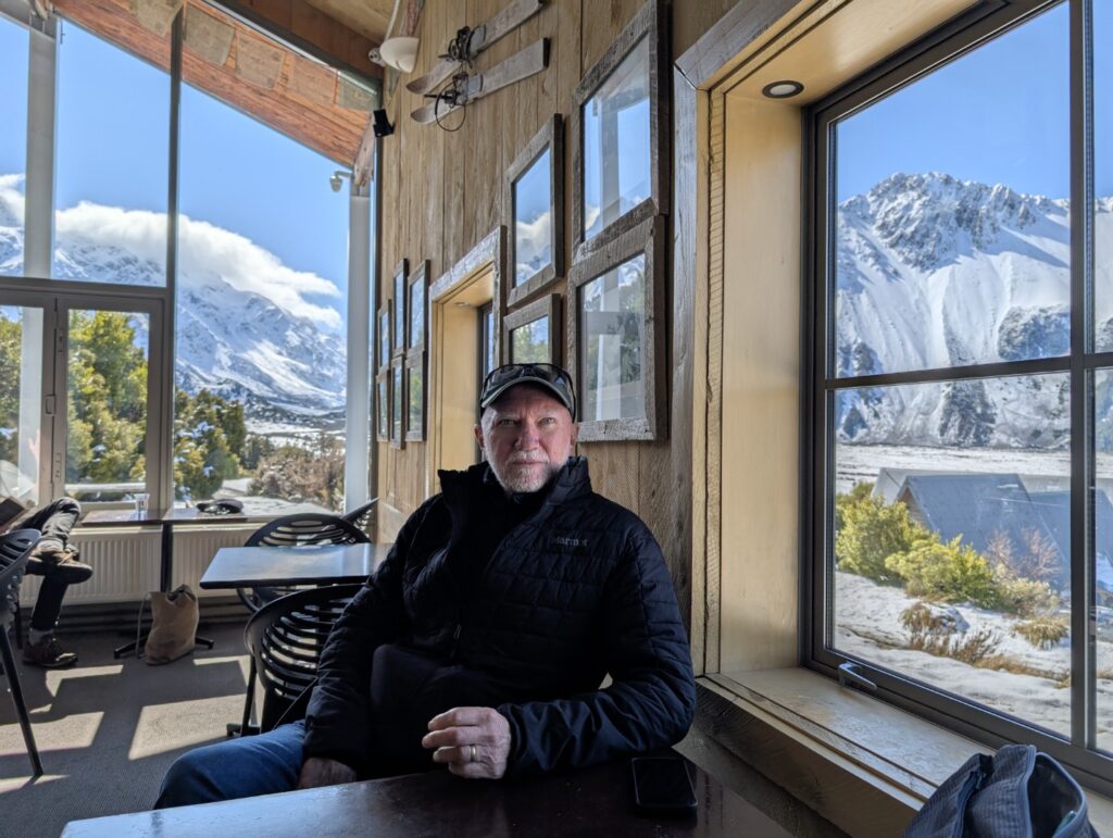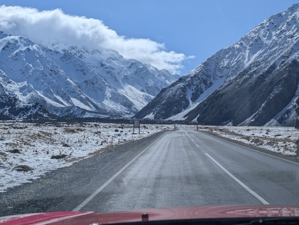 Back on the road, Mt Cook and it’s surrounding mountains grew larger and larger in the windscreen. Finally we arrived in Mt Cook Village and pulled in to the carpark of the Aoraki- Mt Cook National Park Visitor Centre. There was plenty of snow on the ground here. We had a look around the exhibits and decided to grab a light lunch in the nearby cafe. Hot chips and coffee with a great view.
