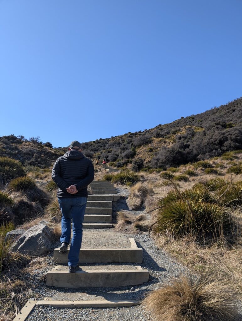 After walking back to the car, we decided to drive the 8km down the road to walk the Glacier View trail. which climbs a multitude of stairs up past the Blue Lakes to a viewpoint on the moraine wall. From there, you can see across the valley taking in the glacier, terminal lake and surrounding mountains. There were a LOT of stairs! I had to stop a few times on the way up and was puffing madly at the top, but it was worth it for the view. The Blue lakes are no longer blue, but green. This is because they are no longer fed by the glacier ( which would make them blue) and are home to algae ( which makes them green)