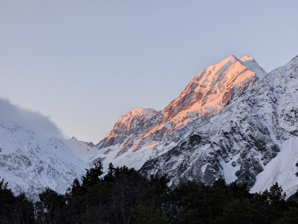 As we walked back up the road to the Hermitage we watched the sunset lighting up the top of the mountain in a glow of pink. We have our fingers crossed for sunshine again tomorrow as we head down to Queenstown.