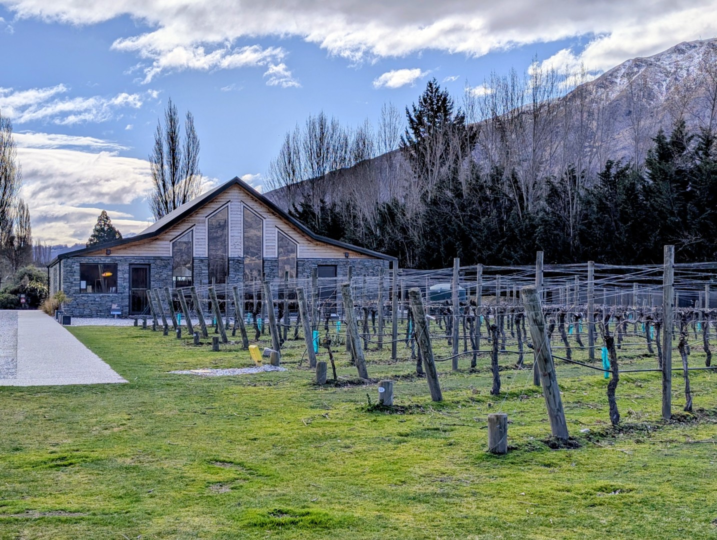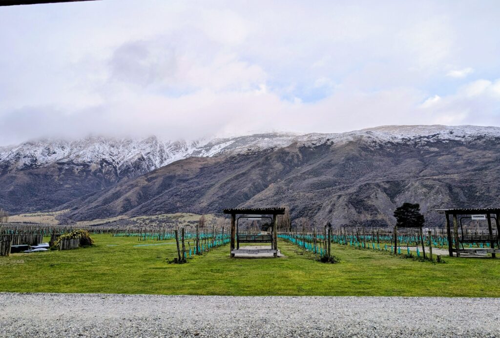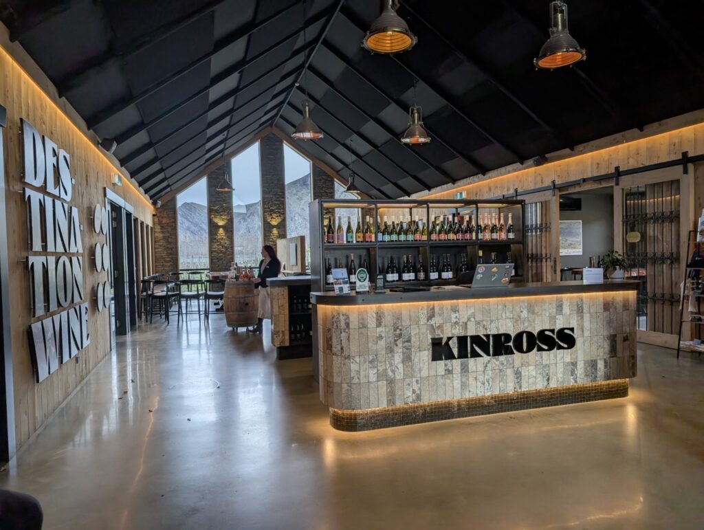 Back at our little winery cabin we thawed out for an hour and then walked out in the wind again to head for the Cellar Door. Our accommodation package includes an intensive wine tasting. The Kinross cellar door represents their own vintages as well as the wines of 5 other small local vineyards. Our sommelier, Marcelle, was a passionate lover of wine and was also very French! He explained why this region produces outstanding cold climate wines, particularly Pinot Noir, and we sampled 6 wines which were all delicious. I’m not generally a fan of reds but all three of the Pinot Noir that we tried were excellent. One of them comes from a winemaker who has been awarded the best Pinot Noir in the World four times! We chatted with the two other couples who were all Kiwis and were very familiar with these wines, in fact they were subscribers to the Kinross wine club and enjoyed coming back and visiting here regularly.