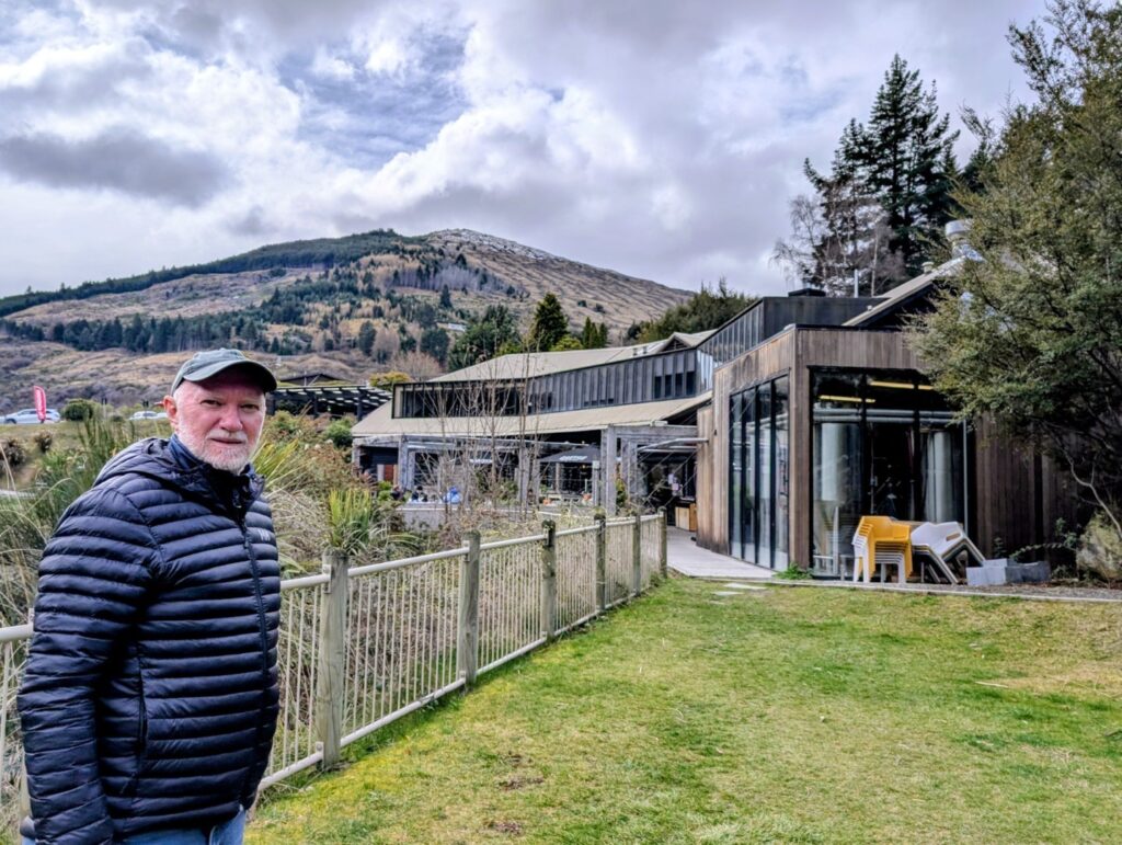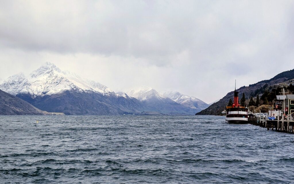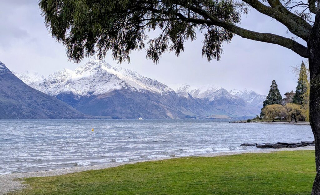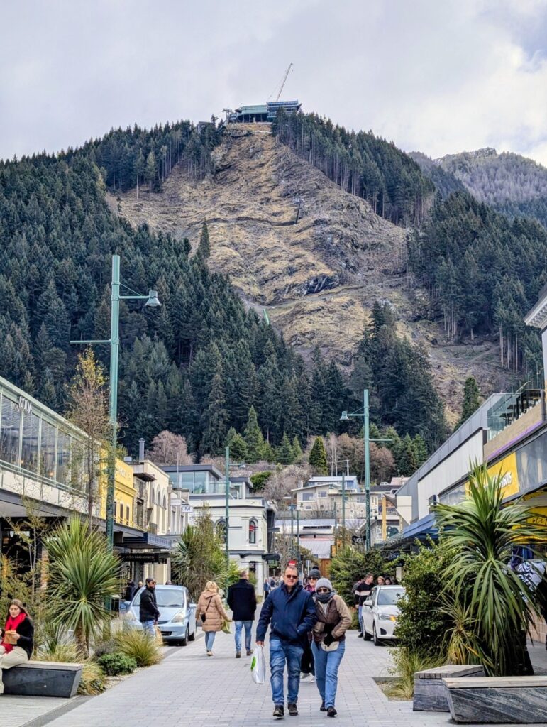 We found parking in a large multi-story carpark in the center of the town. We spent a while wandering around the busy, busy shopping streets and malls and down to the waterfront. To be honest I’m not really a fan of Queenstown. I remember it as being busy and touristy ( as Ski resort towns often are) but it has become even busier and tackier in the last 25 years. Back then the waterfront right in town was quite attractive, now the view of the lake is obscured by the docks for the Real NZ tourist boats and the rows of pop up stands with people selling all sorts of touristy tat. If you needed to buy press on nails, or huge lollies on a stick then you would be in just the right place! We both agreed that the main town waterfront, and the overcrowded shopping malls that run up the hill made the place feel like Vegas-By-The-Lake. Fortunately, you can get away from it, and can see the lovely lake and Remarkables in a more pleasant setting by walking down away from the town center along the park that edges the lake – which is what we did!