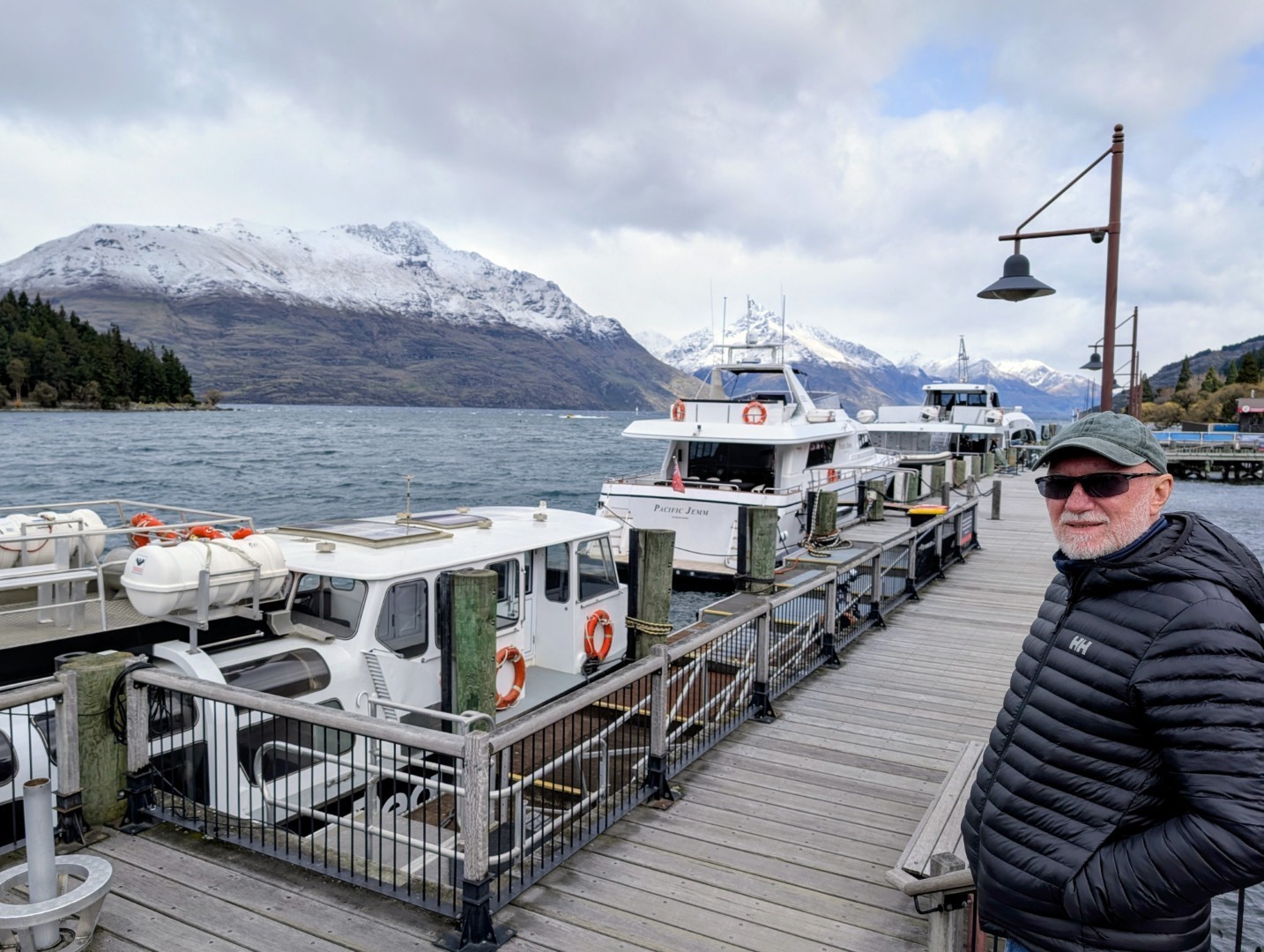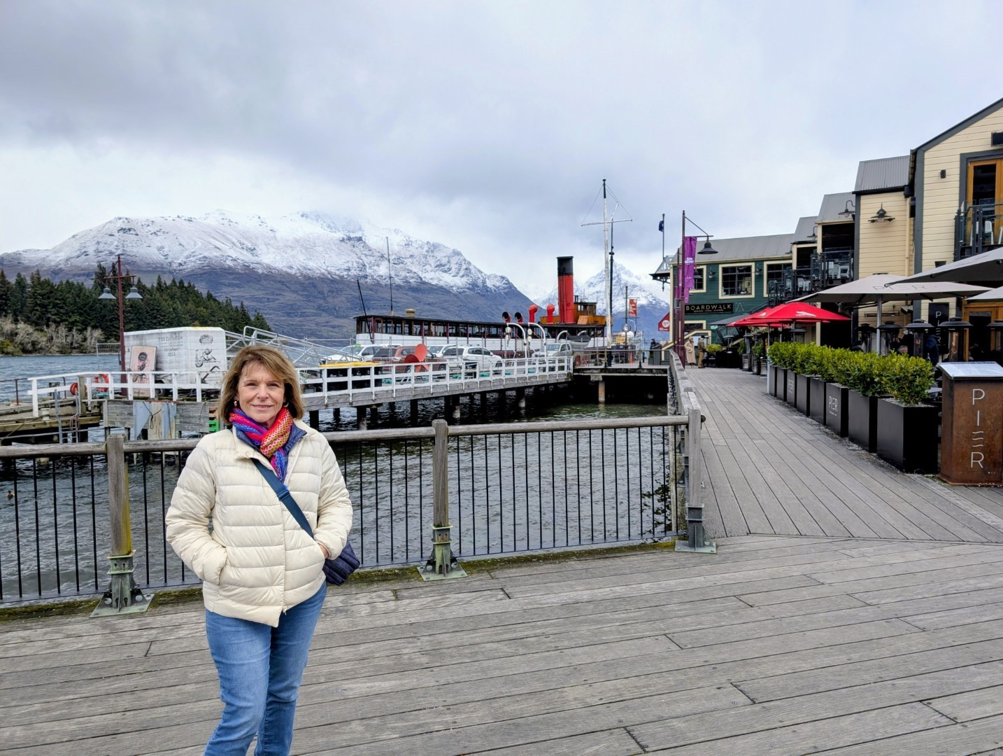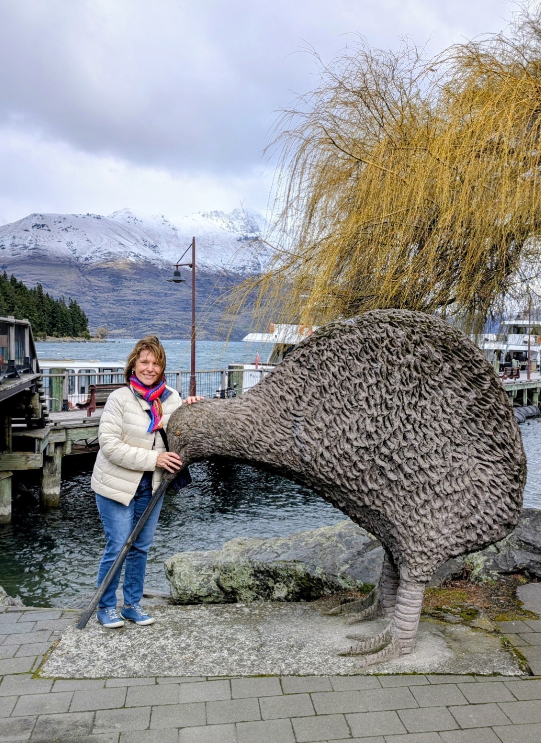 We found parking in a large multi-story carpark in the center of the town. We spent a while wandering around the busy, busy shopping streets and malls and down to the waterfront. To be honest I’m not really a fan of Queenstown. I remember it as being busy and touristy ( as Ski resort towns often are) but it has become even busier and tackier in the last 25 years. Back then the waterfront right in town was quite attractive, now the view of the lake is obscured by the docks for the Real NZ tourist boats and the rows of pop up stands with people selling all sorts of touristy tat. If you needed to buy press on nails, or huge lollies on a stick then you would be in just the right place! We both agreed that the main town waterfront, and the overcrowded shopping malls that run up the hill made the place feel like Vegas-By-The-Lake. Fortunately, you can get away from it, and can see the lovely lake and Remarkables in a more pleasant setting by walking down away from the town center along the park that edges the lake – which is what we did!