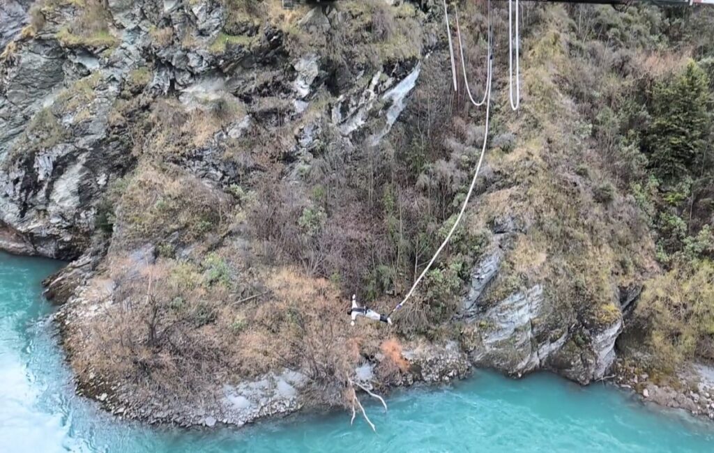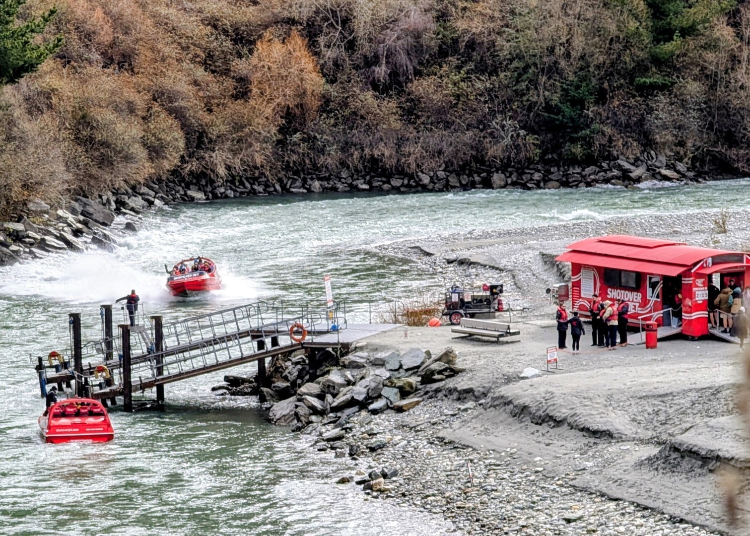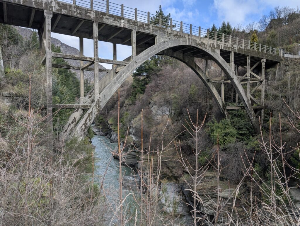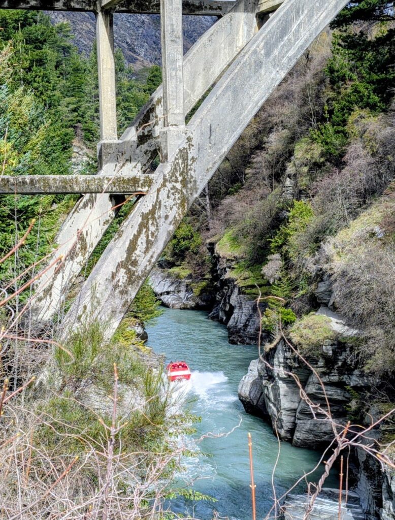 We were getting hungry so I suggested we head to Canyon Brewing for lunch. This local craft brewery sits on the edge of the Shotover River, right near the Edith Cavell Bridge. It’s next door to the main headquarters of the Shotover Jets, so after a tasty lunch and a new beer for Neil to try, we went up to the viewing platform to watch the jetboats tearing up and down the narror river gorge.