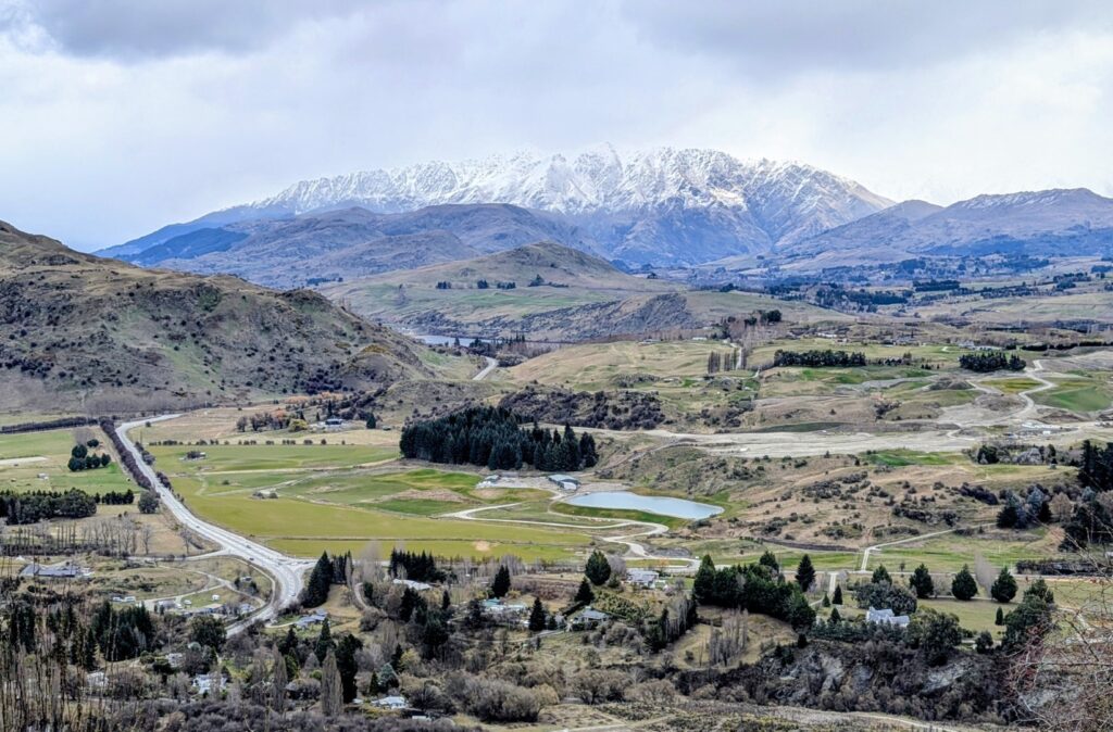 We took a short detour to drive up to the first lookout on the Crown Range Road. This is a high country backroad the connects Queenstown and Wanaka. The views were lovely but it was blowing a gale and freezing!