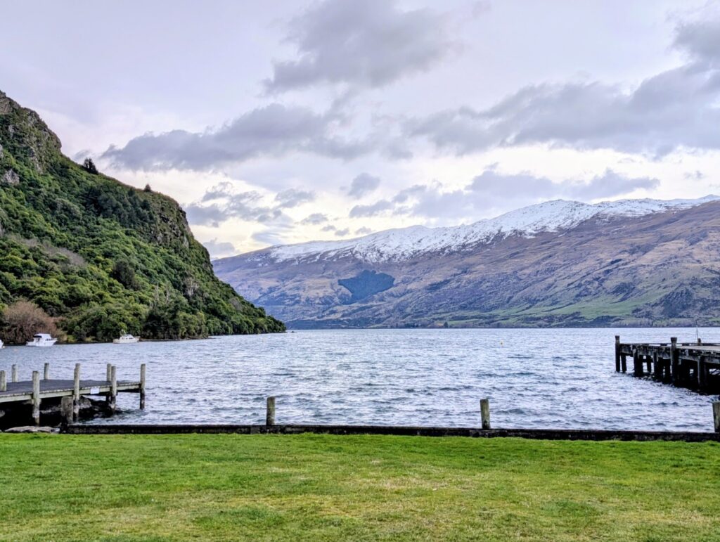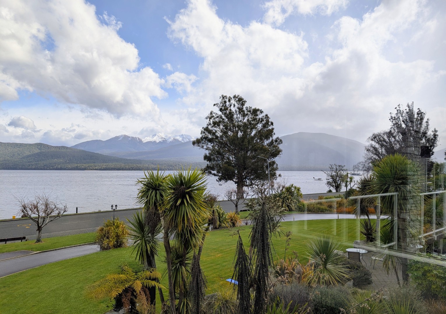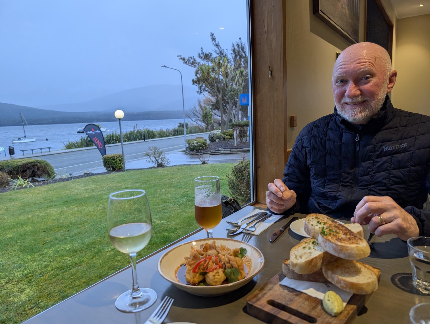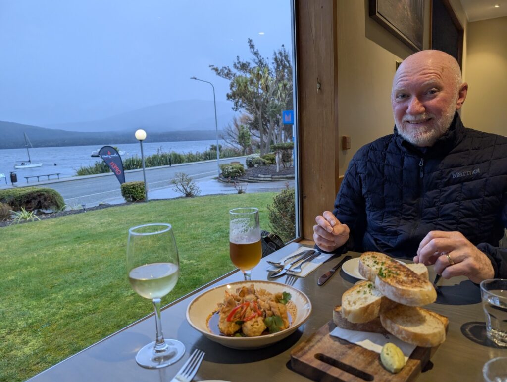 Luckily the rain stopped and the sun came out for a while which gave us a chance to go for a stroll up the lakefront. However the rain started again JUST as we got back to the motel so we relaxed for a while before deciding what to do for dinner. There are several restaurants within a 10 minute walk but tonight we decided to head to the nearest one, Jimmy Cook’s Kiwi Kitchen, and it was a good choice! We went early as we didn’t have a reservation, but we needn’t have worried, the place was empty and the host was very happy to greet us and to show us to the best window table.