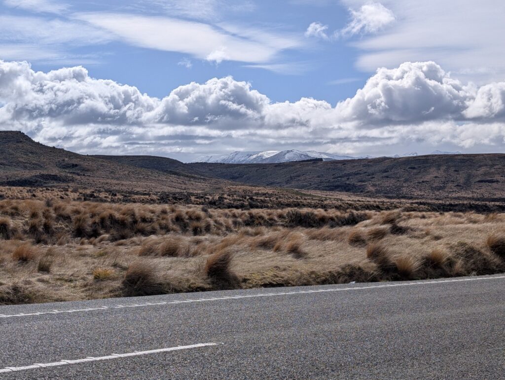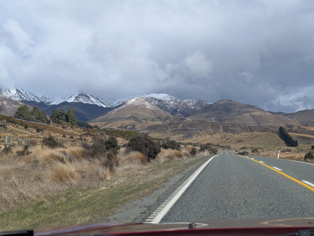 The road continued south and led through very sparse alpine country. At one point we drove through a large landscape covered in reddish gold tussock grass that is within the Red Tussock Conservation Area This area is renowned for its grasslands, which are integral to the local ecosystem. These grasslands provide essential services such as water filtration and soil protection. They also serve as a habitat for native species like the takahe, a flightless bird that relies on red tussock for food and shelter. It coloured the hills red for miles around.