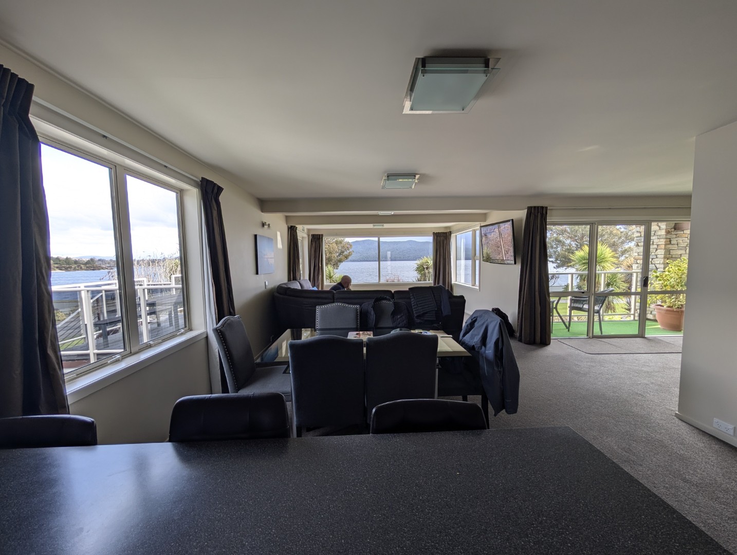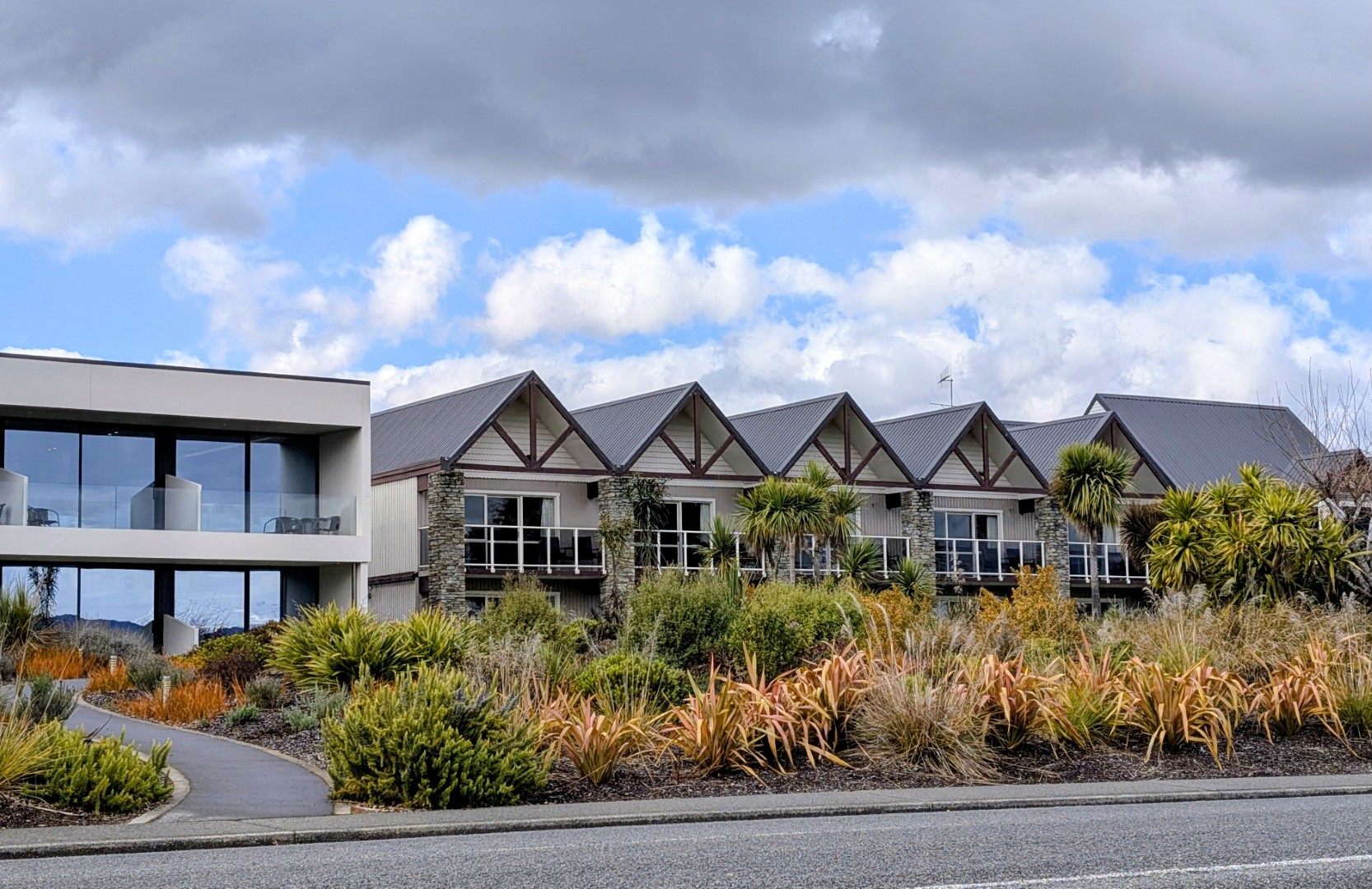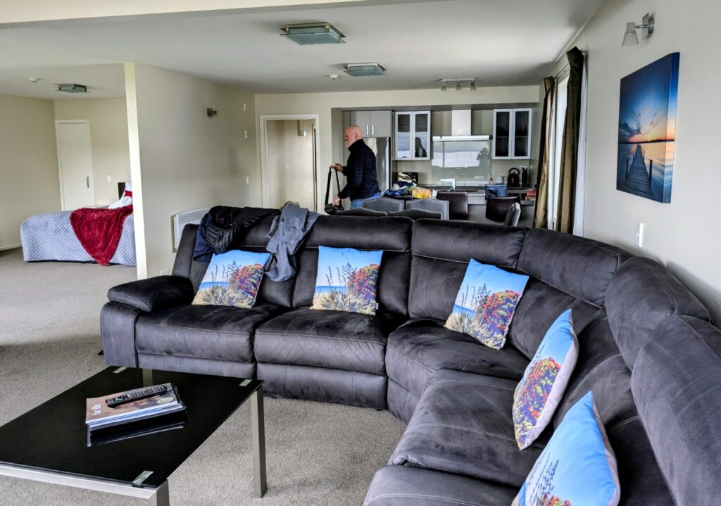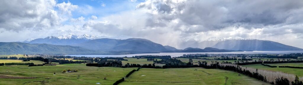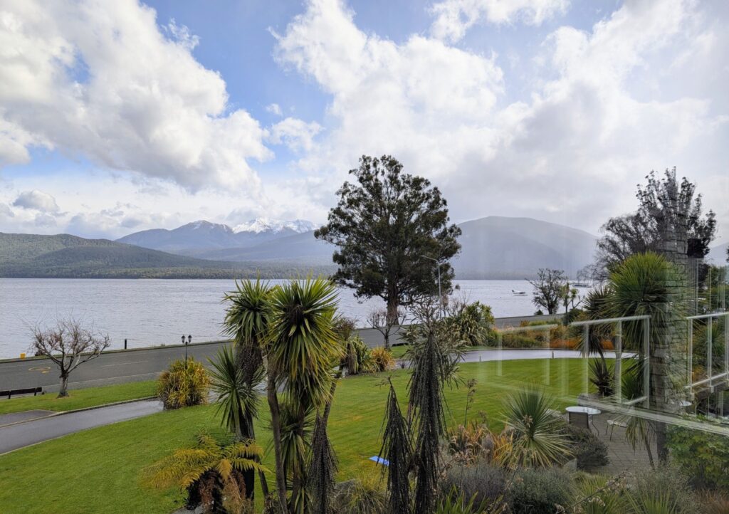The sky had been bright when we left Queenstown but the further south we drove the clouds grew more and more gloomy. When we finally arrived in Te Anau it had started to drizzle so we dropped in to visist the Fiordland National Park Visitor Center. We’d been there about five minutes when the young woman from the desk apologetically told us that they were closing for their lunch and we’d have to leave! It really is the slow season here! We drove into the town and had a tasty lunch at a cafe to fill in time before we could checking in to our hotel, the Fiordland Lakeview Motel & Apartments.