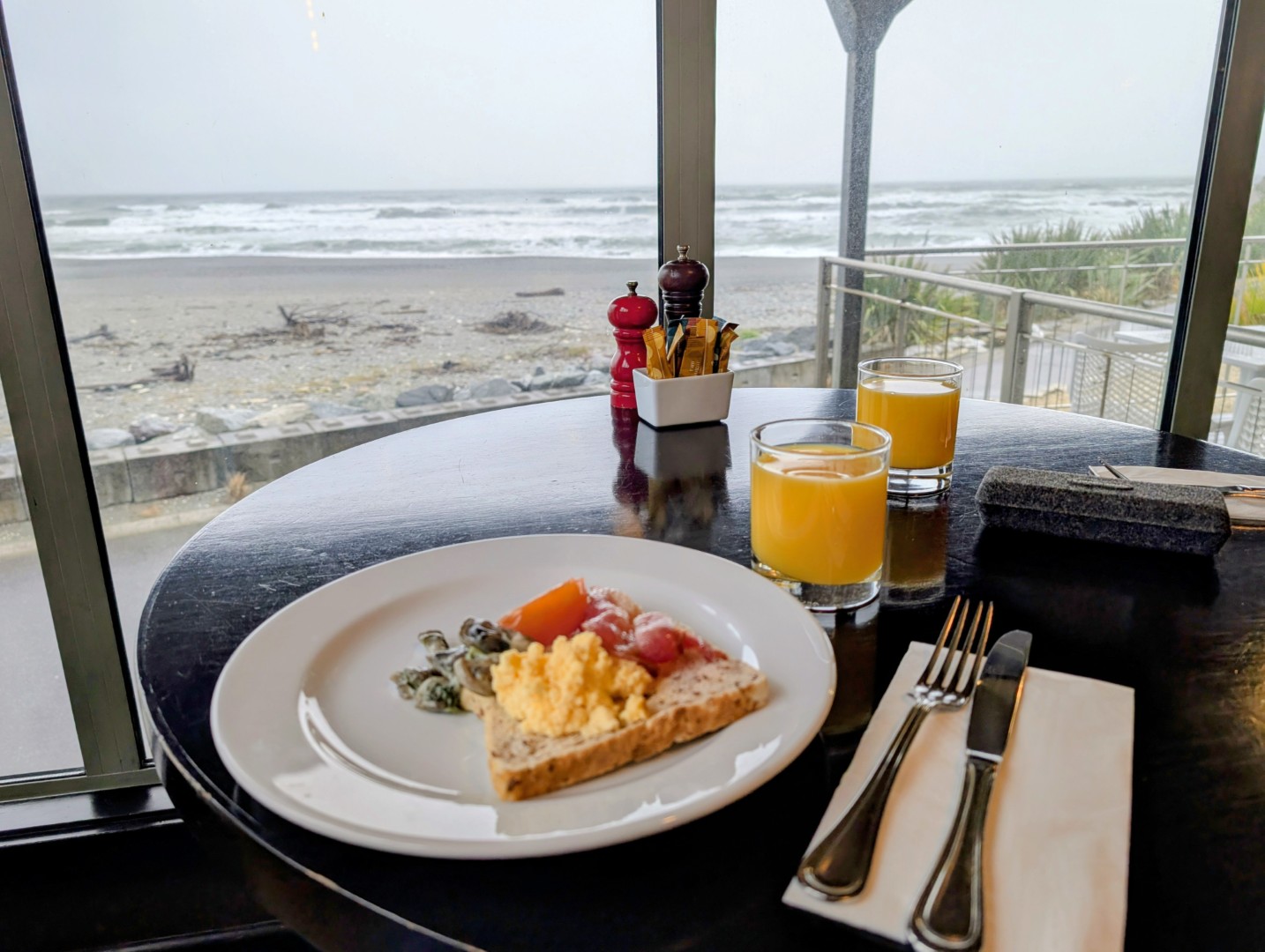 Well the weather report was right, it was bucketing down this morning! We had to put our raincoats on to get to breakfast and the view from the restaurant was much greyer than yesterday.