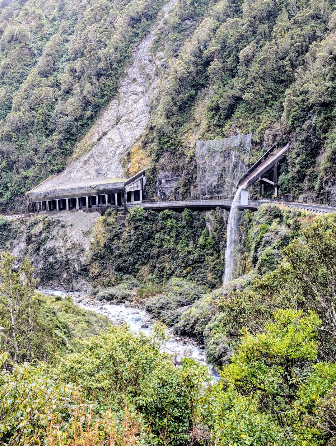 The road started to wind through the narrow Otira Gorge and we found ourselves driving through the rock shelter. • The rock shelter was constructed to capture and deflect the almost continuous rockfall from the cliffs above the gorge, this has been an issue since the road’s original construction in the 1860s.