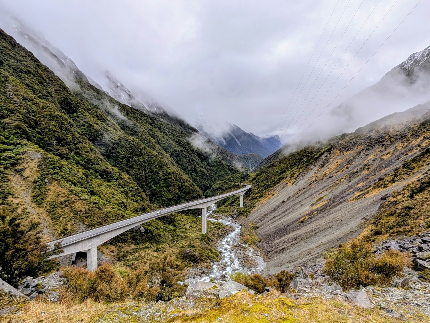 Next we drove over the Otira Viaduct. Completed in 1999 by McConnell Smith Pty Ltd, the 440 metres (1,440 ft) four-span viaduct carries State Highway 73 over a stretch of unstable land, replacing a narrow, winding, dangerous section of road that was prone to avalanches, slips and closures.
