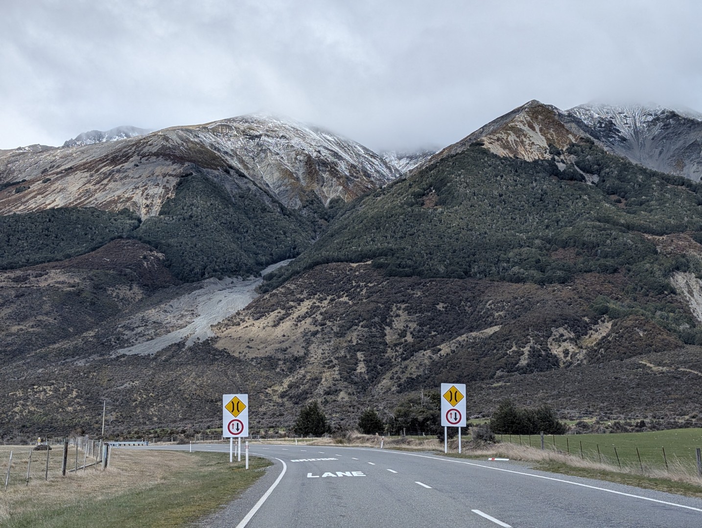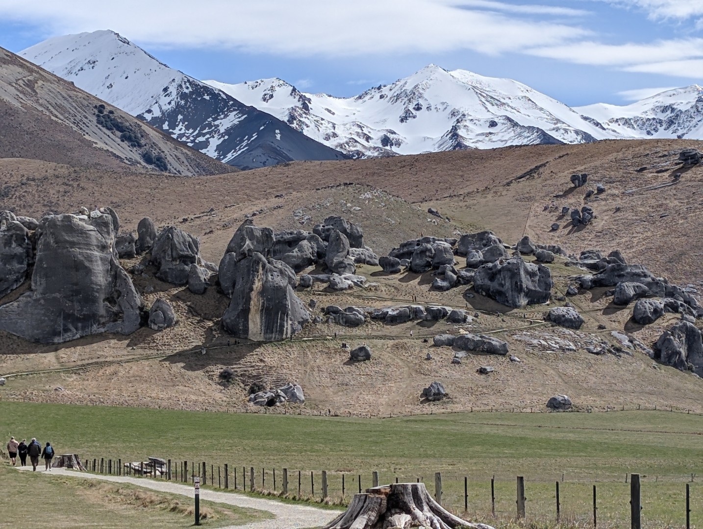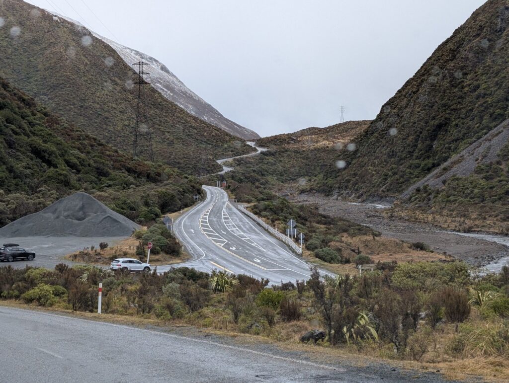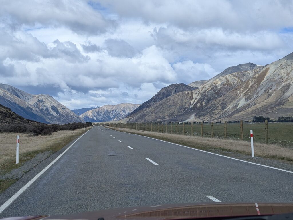 We stopped briefly in the carpark of the Castle Hill formation. These limestone rock formations are striking – you see them from a long distance on your approach. The grand limestone outcrops of Kura Tāwhiti hold great cultural significance for Ngāi Tahu, and there were many people setting off to walk up to them and walk amongst them. I’d planned for us to do it too, but it was very cold and the wind was freezing and neither of us felt that the walk would improve our colds – so we took a picture and drove on. Next time!